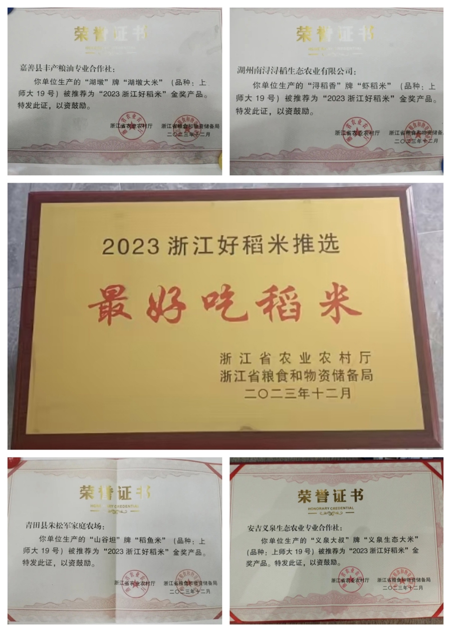 转折点终于到来。在“2023浙江好稻米”评比中,“上师大19号”一举斩获五项金奖中的四席,评委们被其独特的清香和弹糯口感所征服,“四好”美誉不胫而走。很快,一个个喜讯接踵而至:贵州省台江县首季试种夺冠、首届长三角优质稻米评鉴金奖......