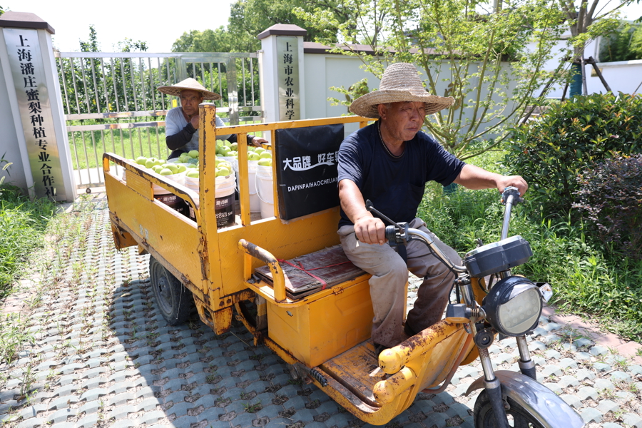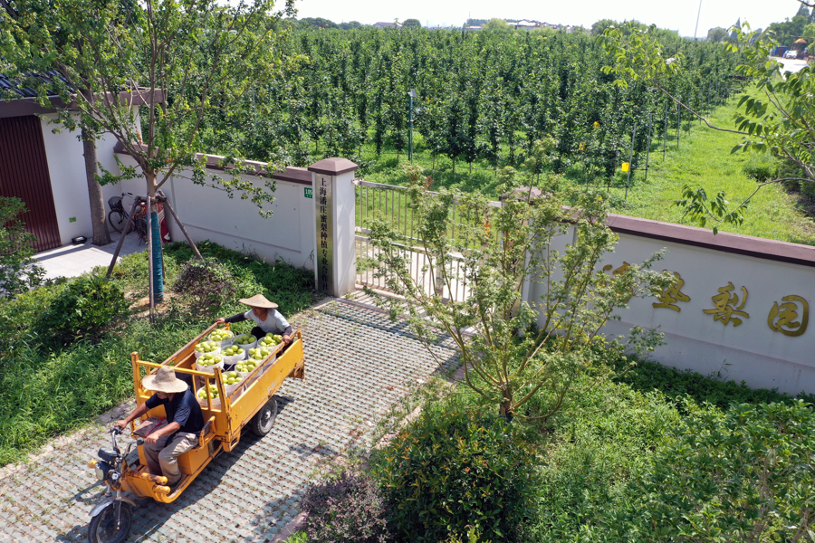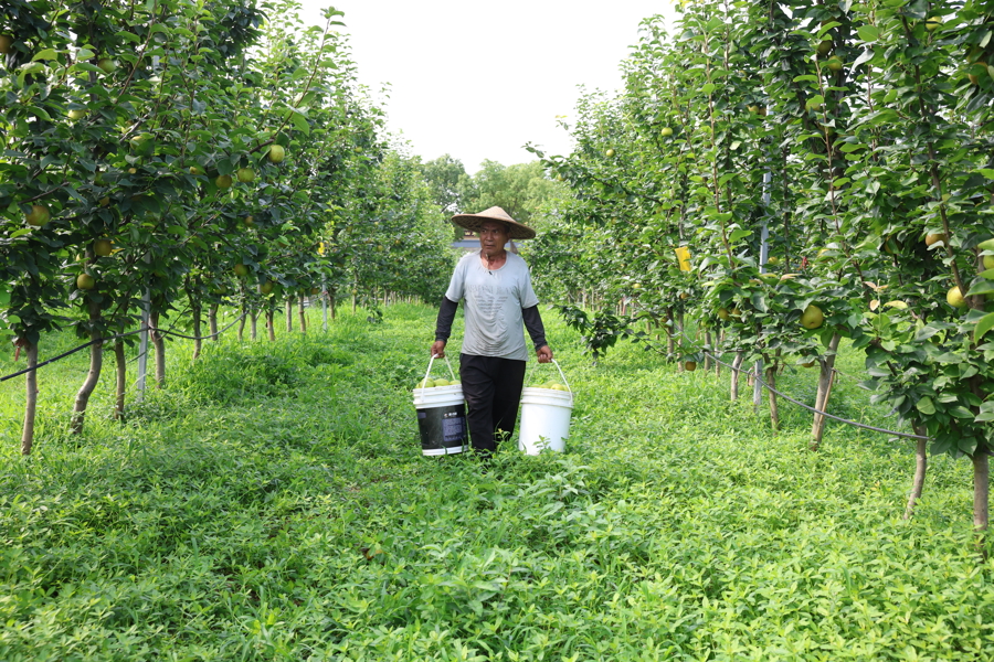 2025年7月15日,奉贤“庄行蜜梨”首家示范基地——上海潘庄蜜梨种植专业合作社的梨园内,250亩梨树早熟品种陆续上市。