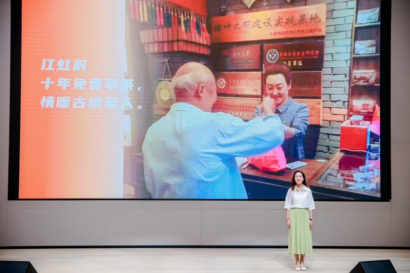 青浦区融媒体中心主持人张佳祺,道德模范代表陈劭龙、关立平、江虹蔚、俞雄辉共同启动“城市文明开放麦”青浦专场活动。张佳祺与青年导演、青年配音演员王博,从专业角度作细致点评,为文明故事提炼“文明金句”。