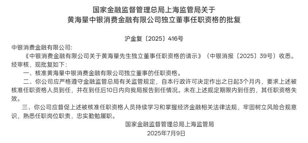 7月16日,国家金融监督管理总局上海监管局发布关于黄海量中银消费金融有限公司独立董事任职资格的批复,核准黄海量中银消费金融有限公司独立董事的任职资格。