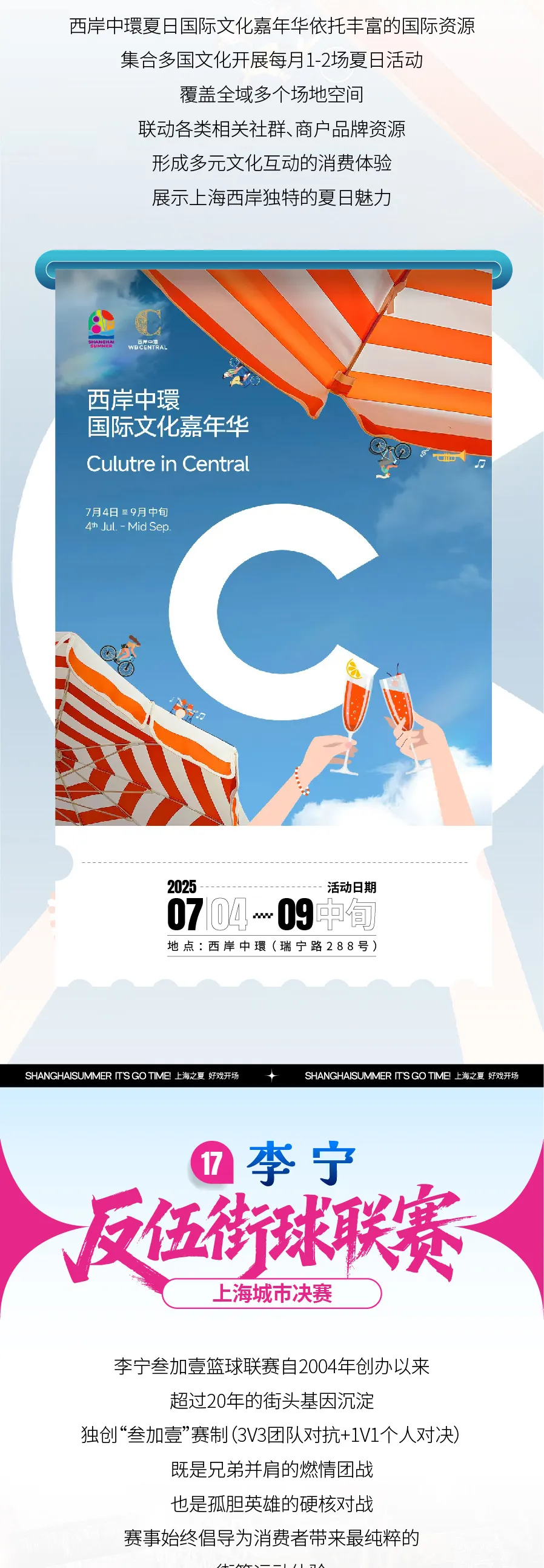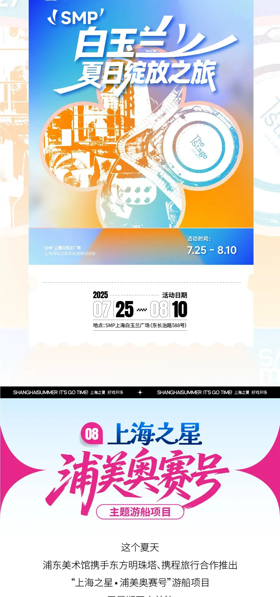 这个夏天,上海以18场“城市定制活动”为支点,撬动“文旅商体展”全领域300+场活动渐次展开,从百年弄堂到滨江地标、从国际艺术到本土潮玩、从亲子互动到潮流运动,丰富多彩的夏日活动为全球友人递上一张“沉浸式体验”的城市名片,诚邀旅客走进上海、感受上海、爱上上海。详见↓