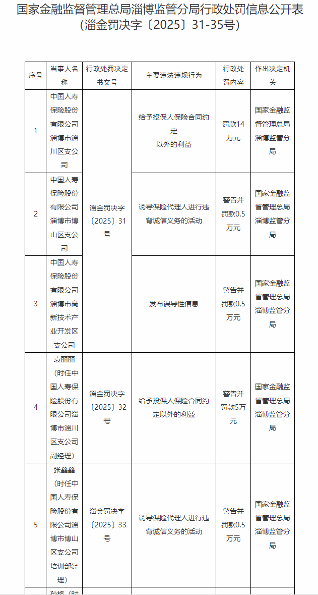 中国人寿保险股份有限公司淄博市淄川区支公司,给予投保人保险合同约定以外的利益,被罚款14万元;袁丽丽(时任中国人寿保险股份有限公司淄博市淄川区支公司副经理),被警告并罚款5万元。