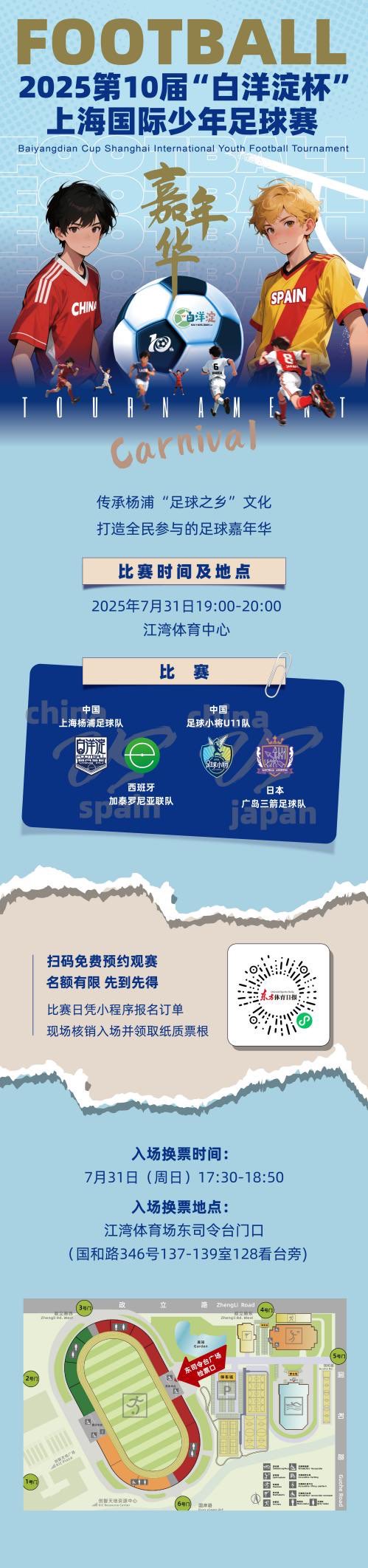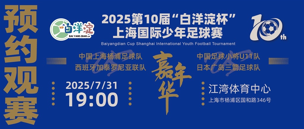 据悉,本届比赛由上海市体育局指导,杨浦区人民政府主办,杨浦区体育局、杨浦城市建设投资(集团)有限公司、东方体育日报社承办。比赛将于7月28日至30日在杨浦区白洋淀足球场举行,八支国内国际队伍将通过单循环赛的方式累计积分,角逐本届赛事的冠军奖杯。 7月31日的最后一轮比赛将在江湾体育中心举行。中国上海杨浦足球队VS西班牙加泰罗尼亚联队、中国足球小将U11队VS日本广岛三箭足球队两场比赛将开放门票预约,观众可以到现场一睹小将风采。