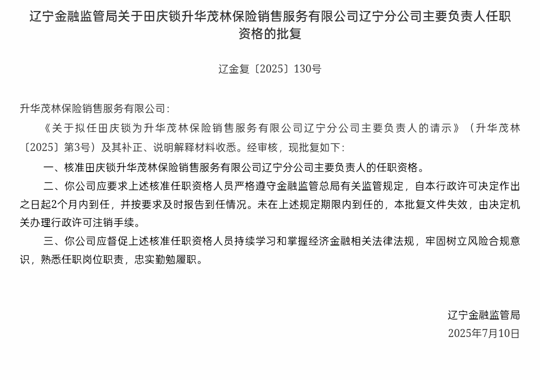 7月18日,国家金融监督管理总局辽宁监管局发布关于田庆锁升华茂林保险销售服务有限公司辽宁分公司主要负责人任职资格的批复,核准田庆锁升华茂林保险销售服务有限公司辽宁分公司主要负责人的任职资格。