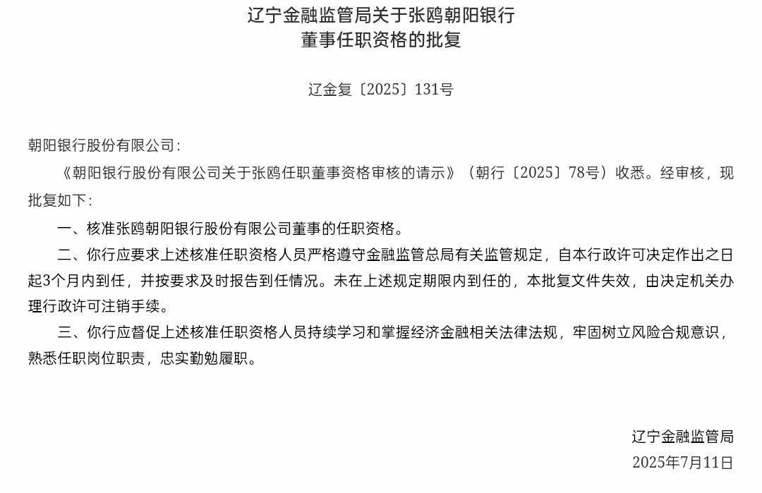 7月18日,国家金融监督管理总局辽宁监管局发布关于张鸥朝阳银行董事任职资格的批复,核准张鸥朝阳银行股份有限公司董事的任职资格。