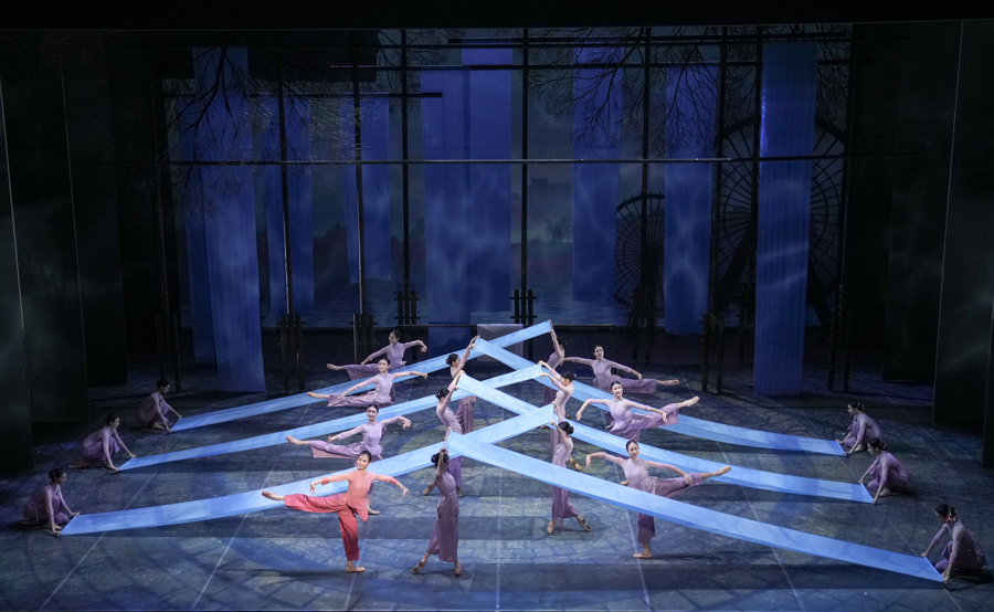 染坊女工晾晒布匹的舞步轻快整齐,“借被子”的诙谐灵动引发阵阵笑声,唯美的双人舞洋溢青春的活力,气势磅礴的群舞展现出强大的凝聚力和生命力。从笔尖到足尖,演员以柔美而富有张力的肢体语汇将文学作品中的细腻情感层层铺展。