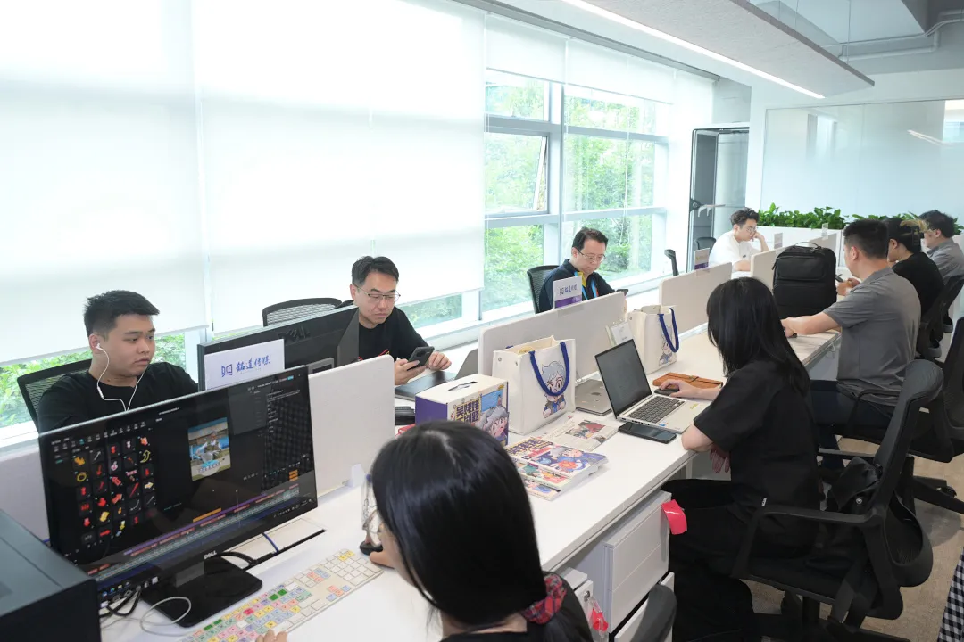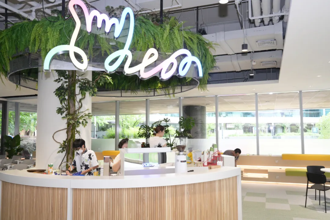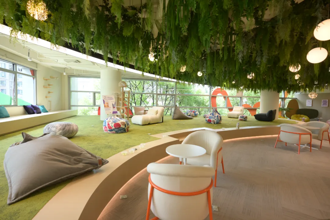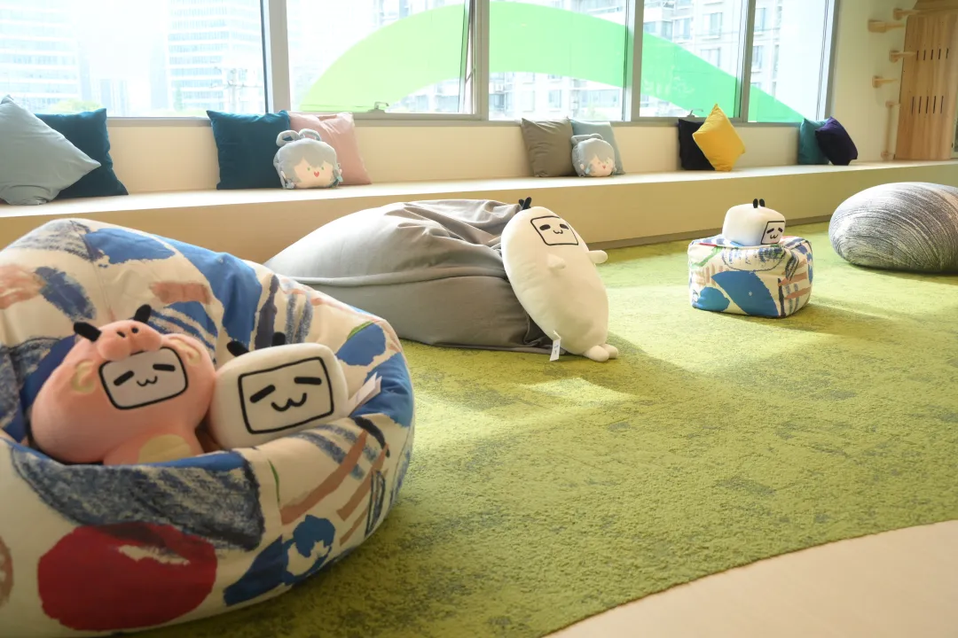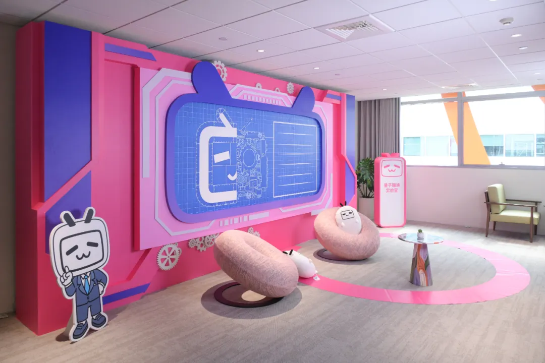 直播当天,这些设施吸引了不少目光:智能会议室的大屏上实时投影弹幕,休憩区的懒人沙发和绿植墙营造出轻松氛围,甚至连走廊的“数字画廊”也滚动播放着UP主们的代表作。