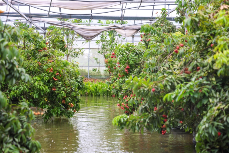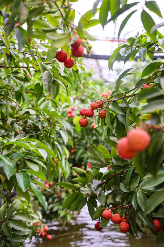 与传统岭南荔枝种植相比,开太农场的“水上立体种植”模式堪称一场农业革新。走进荔枝采摘大棚,双层棚膜下的“小气候”让人恍若置身岭南——温度恒定在25℃左右,细密的喷灌水珠模拟着热带阵雨,空气中弥漫着清甜水汽。
