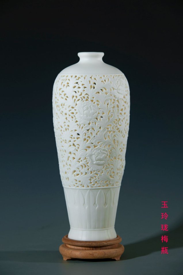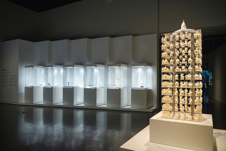 “盛世鼎新”以德化白瓷的守正创新为叙事主题,集中展示当代大师的经典力作,并置展出不同大师的同类型作品,观众可于匠心对话中窥见德化瓷的传承与变革。该板块作品主要分器物和人物两大类,如曾入选金砖国礼的《玉玲珑梅瓶》、特设滴水声效的《滴水观音》等。