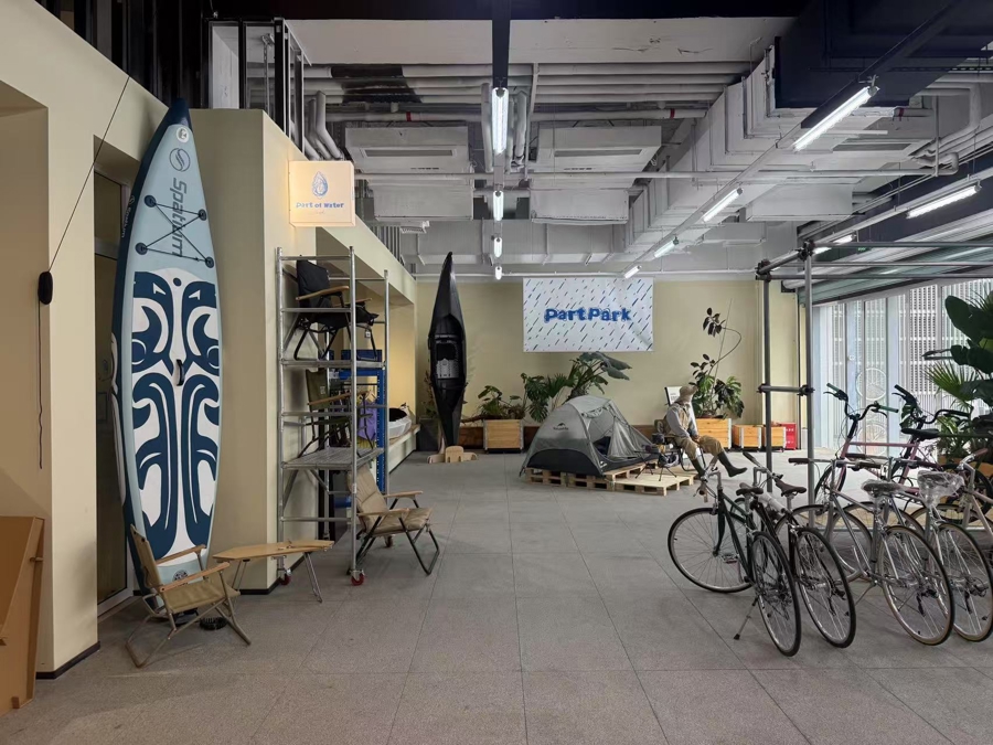在上海浦东光音广场,一处运动主题的空间Part park局部公园开业仅半年,已经成为社交媒体上小有名气的打卡点,其中一条高赞评论这样写道:“很难具体形容这是一家什么样的店,里面可以攀岩、打乒乓球,甚至还可以露营。”