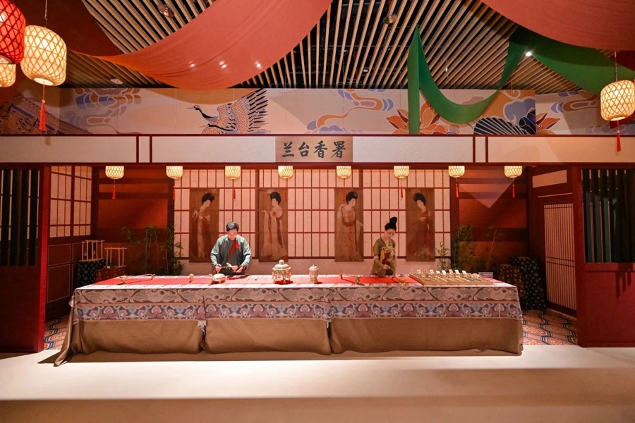 展览还在尾厅打造“唐代西市·沉浸式社教体验区”,设置如李白酒肆、杜甫书斋、陆羽茶坊、香坊、弈趣馆、唐风剧场等多个体验工坊,让游客在观展的同时,全方位体验唐人的衣食住行、诗酒茶香,更真切地感受浓墨重彩的大唐文化。