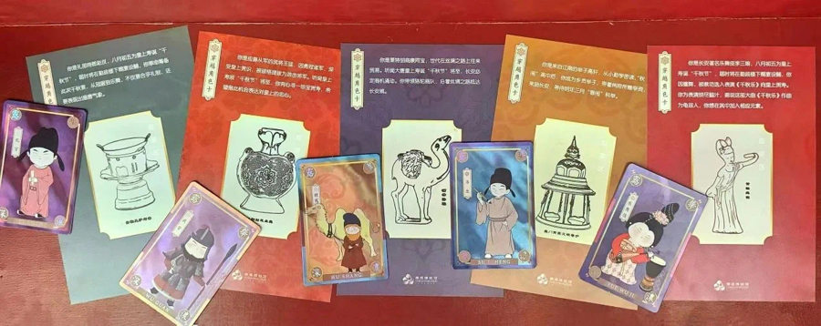 根据展览内容,奉博设计了胡商、乐伎、武官、礼官、书生等不同职业身份卡,观众需在展厅入口处抽取自己的“身份盲盒”,从而拥有对应专属人物故事线和观展导览解密卡。在展厅中,观众还将邂逅对应角色的古装NPC人物,他们或与游客互动,或用小剧场表演引导观众了解展品背后的故事。