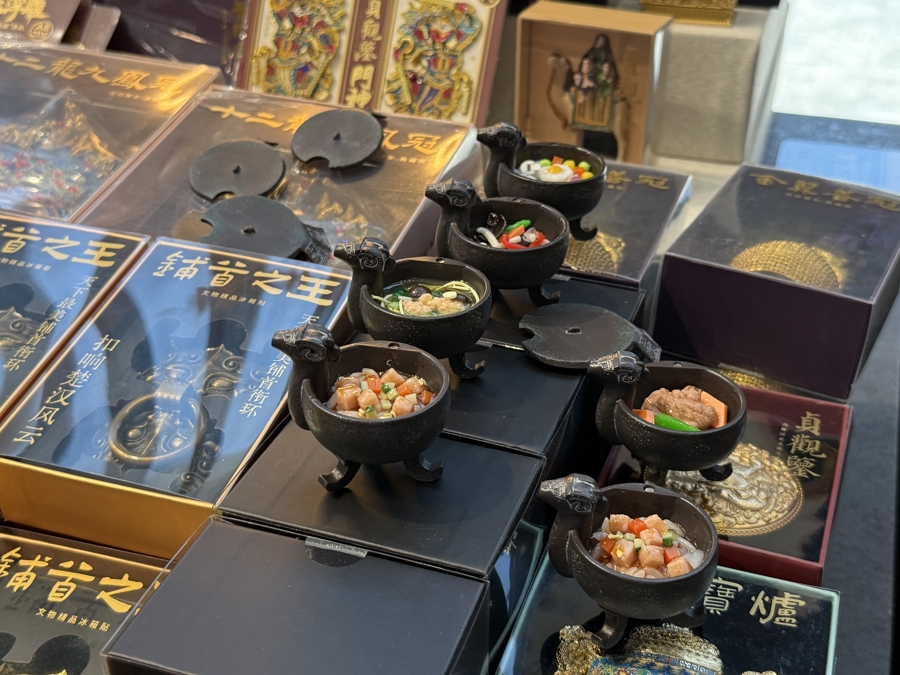 而这些文创不仅造型精美,在功能上也十分契合当下年轻人的喜好。比如,“楚风烈”展把历史上用于盛放食物的文物——春秋附盖三足羊形铜尊开发成“战国便当盒”盲盒,内含30多种“菜色”,顾客购买后还能用内附的材料包自己DIY“做菜”,趣味性和科普性巧妙融合,使其甫一上市就卖到断货。