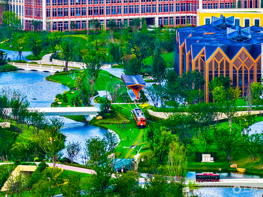 园区内交通系统设计独具匠心,包含内部道路、高架立交桥和有轨小火车网络,共设8个车站(每个组团1个车站),并在E组团-森林小镇地下区域建有检修库。