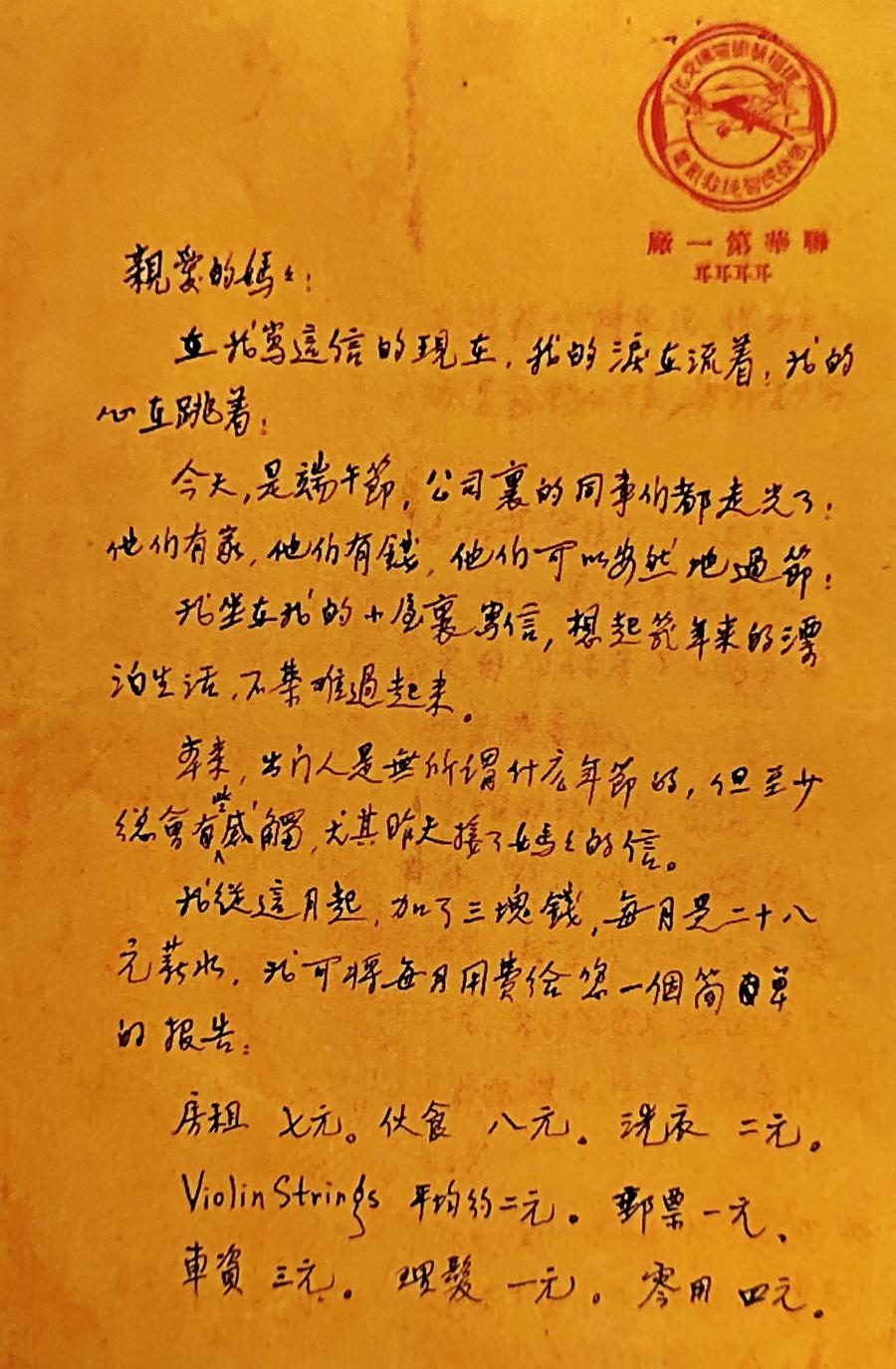 在后来的求学过程中,他从本地老师和外籍老师那里先后学到了小提琴演奏、西洋乐理等,并经常借用老师的小提琴练习,从此,开始如饥似渴地学习西洋音乐。1930年,他来到上海,先后在云丰申庄、联华影业公司第一制片厂谋职。一封写于1933年5月28日端午节这天的家书中,他告诉母亲,自己的月薪已经加了三元,达到28元,其中,“房租七元。伙食八元。洗衣二元。Violin Strings 平均约二元。邮票一元。车资三元。理发一元。零用四元。”由此可见,聂耳由衷地热爱小提琴,每月要从微薄的工资中拿出两元购买Violin Strings(琴弦)。