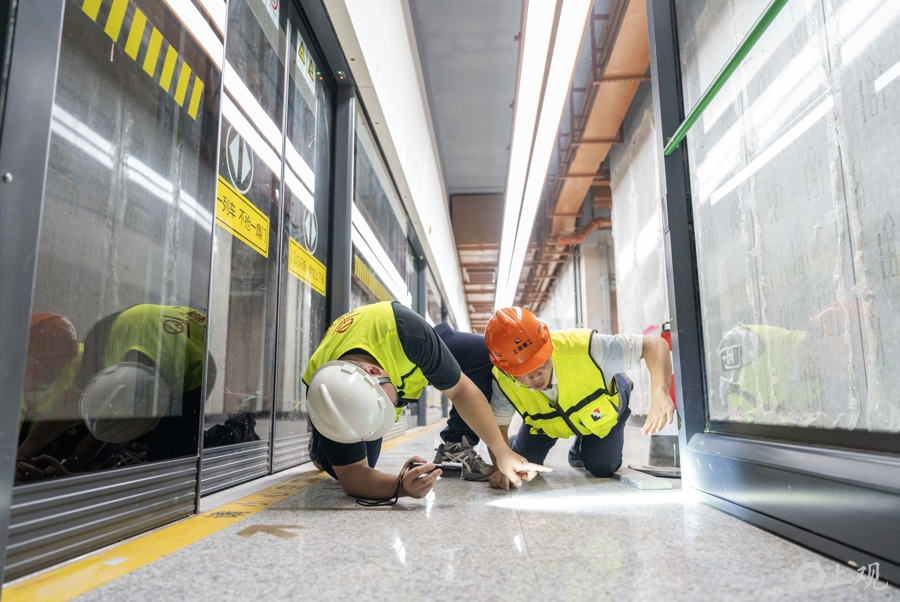 工作人员对蟠祥路站站台设备及装饰装修进行检查。