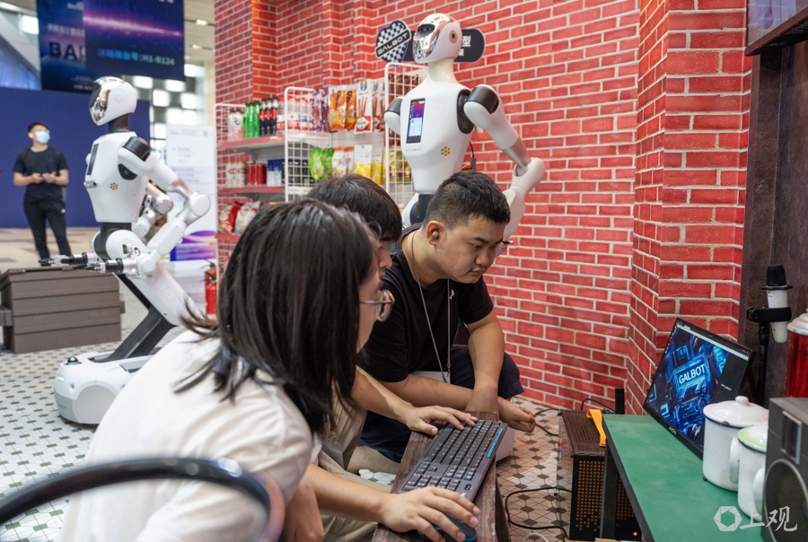 工作人员正在对机器人代码进行调试。
