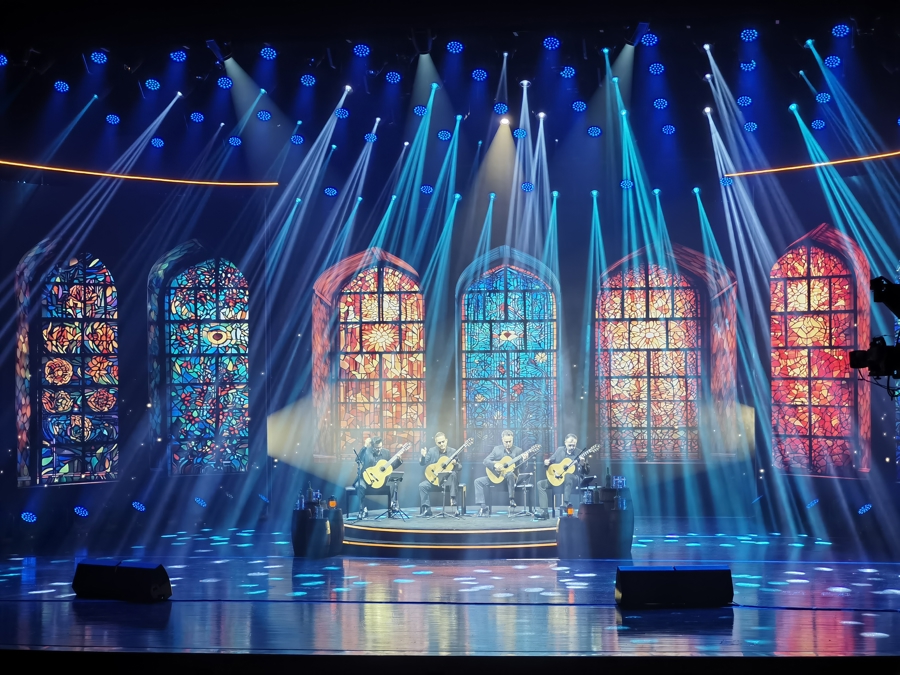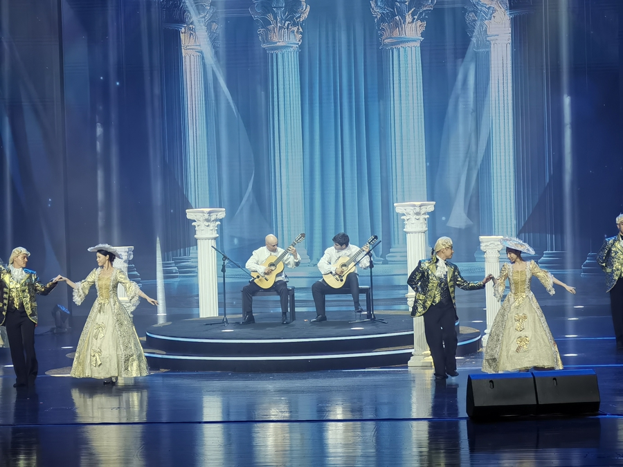 古典吉他的清澈音色穿越千年,与中东悠扬旋律、丝路驼铃回响、典雅的欧洲宫廷乐及弗拉门戈奔放节奏交织共鸣;多媒体视觉艺术将中亚集市的繁华喧嚣、中世纪宫廷的金碧辉煌、19世纪西班牙街头的热情洋溢呈现于舞台之上……