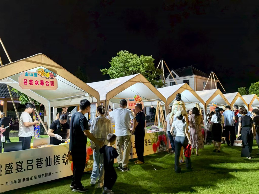 “桃萄争霸赛”优胜者颁奖、“巷创坊”乡村产业招商推荐、“蟠蟠、桃桃”IP形象发布、逛吃特色美食集市、赏灯会看演出……7月26日晚,“瑶池仙果宴八方、融合发展启新程”暨金山区“百里果园”建设成果展示活动在吕巷水果公园举行。吕巷镇邀请广大市民游客品味“蟠桃盛宴”,感受上海“果盘子”的丰收喜悦。