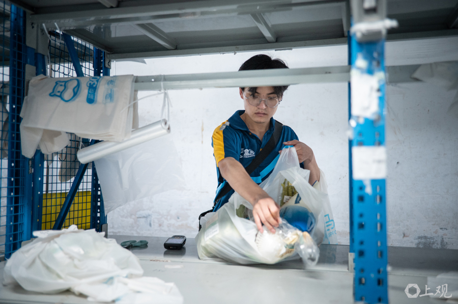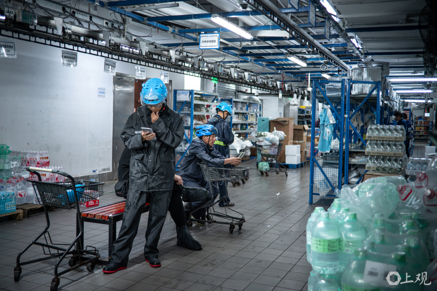 7月30日上午,上海进入竹节草台风的影响范围,风雨开始在市区“上强度”,记者来到位于长宁区的盒马星空仓探访配送情况。
