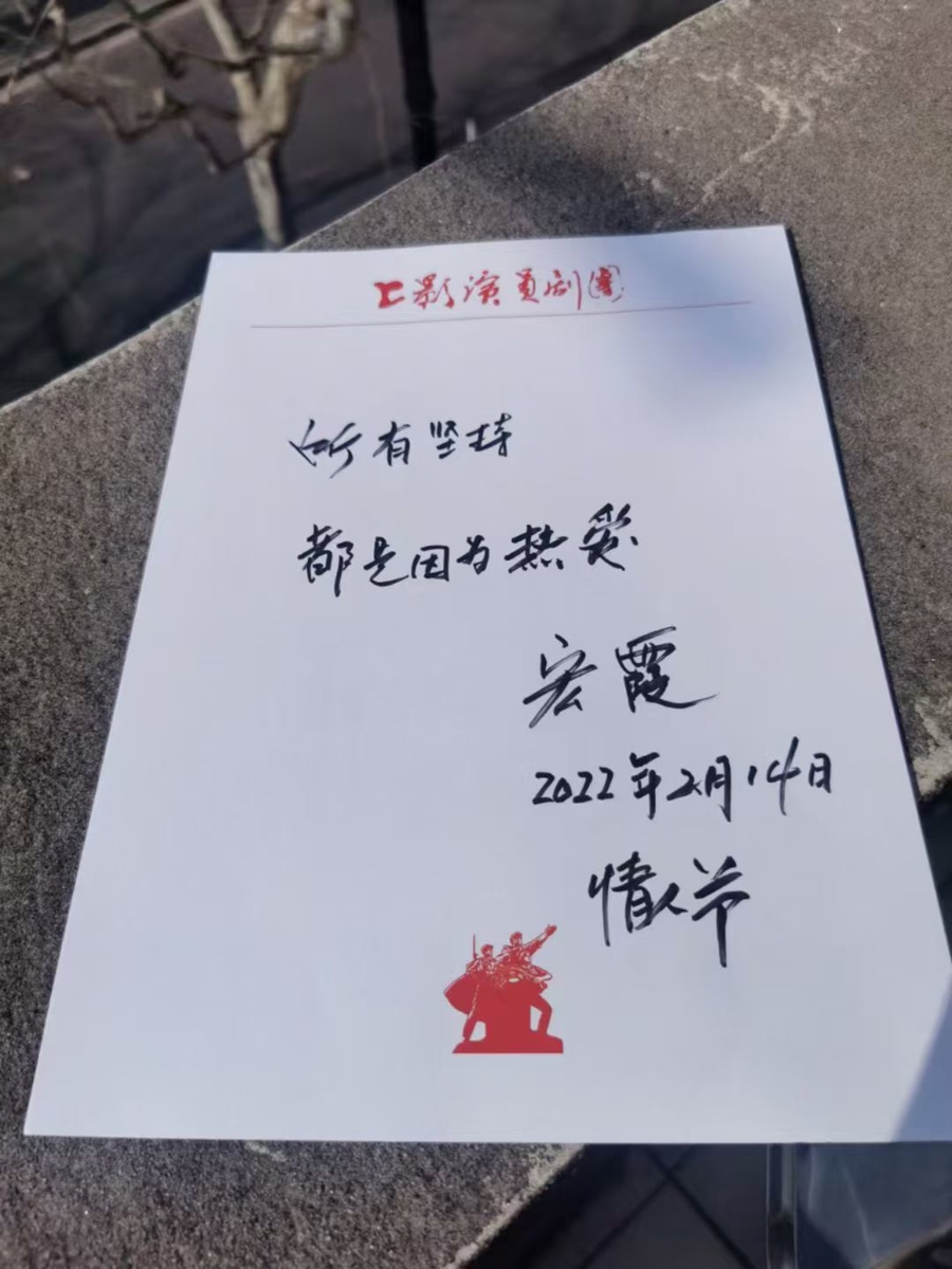 上影演员剧团在上影集团支持下拍摄《我和上影演员剧团》系列访谈节目时,年过九旬的宏霞积极支持录制,为剧团留下了珍贵的口述历史资料。她在节目题词中写道“所有坚持,都是因为热爱”,也让剧团后辈受到鼓舞。