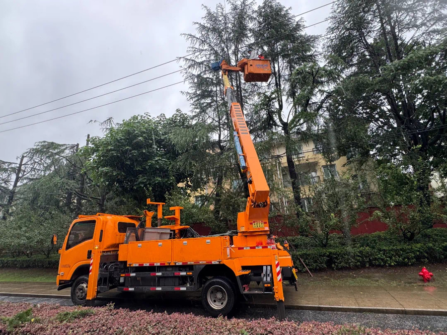 当天,记者在方松街道文诚路看到,带电作业车、电力升降车等设备整齐地停靠在路边。技术人员转移相关作业段电路负荷后,迅速乘坐升降车升至高空,小心翼翼地修剪枝干。地面人员则紧密配合,对修剪下来的倒伏断枝进行切割、清运,并清理周边环境。