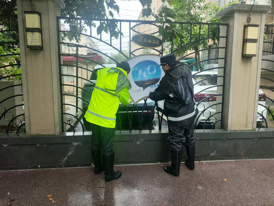 临汾路街道综合执法队在党建引领综合网格协调下,结合物业治理“百日攻坚”行动,成立党员突击队,做到“24小时值守、随叫随到、拉的出、打得赢”。加密对“飞线”充电、加梯施工安全、垃圾分类、擅自设置户外招牌等违法行为的巡查频度,重点督促物业加强监管小区内相关违法违规行为,在商户群不厌其烦再三通知商户做到户外招牌自查自纠,确保台风来临的信息人人知晓、横向到边纵向到底不留死角,从源头防范险情滋生。