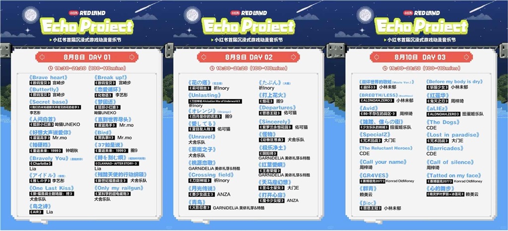 结束了日间冒险,8月8日-10日连续三晚的Echo Project音乐节将在“翻身时空港”的中心舞台特别呈现,以复兴岛夜空为幕,结合楼体Mapping、无人机编队等,打造360°实景剧情舞台。美依礼芽、宫崎步、小林未郁、Lia等人气歌手将登场带来《阴阳师》、《数码宝贝》、《罪恶王冠》、《Air》等经典游戏、动漫神曲的原唱演绎,赖美云、李艺彤、犬舍乐队、圈9等知名艺人也将在现场为玩家们带来《鬼灭之刃》、《咒术回战》《狐妖小红娘》等众多大热IP的系列曲目。