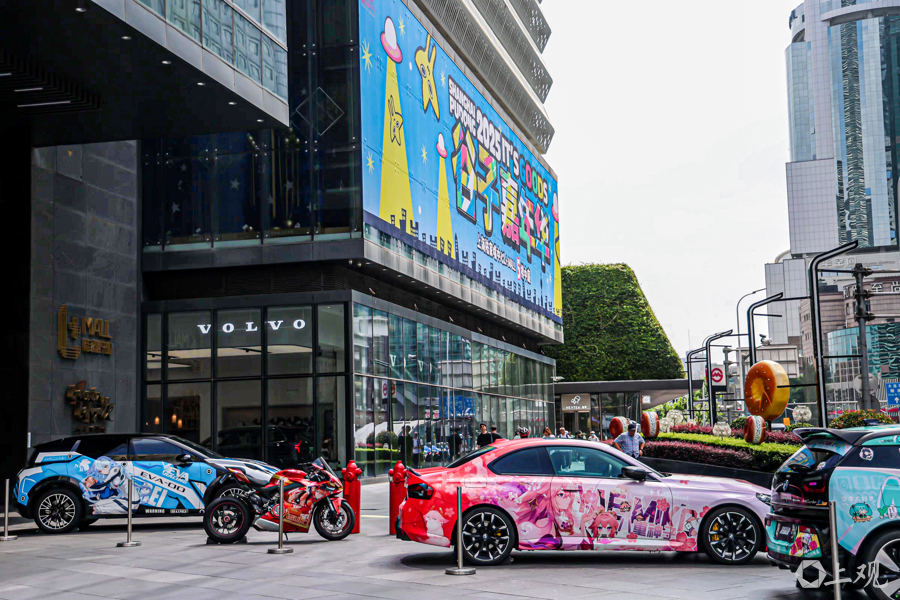 户外广场的痛车艺术展演区尤为吸睛,由"沪痛组"带来的8台初音未来、EVA等经典角色涂装改装车组成震撼方阵。
