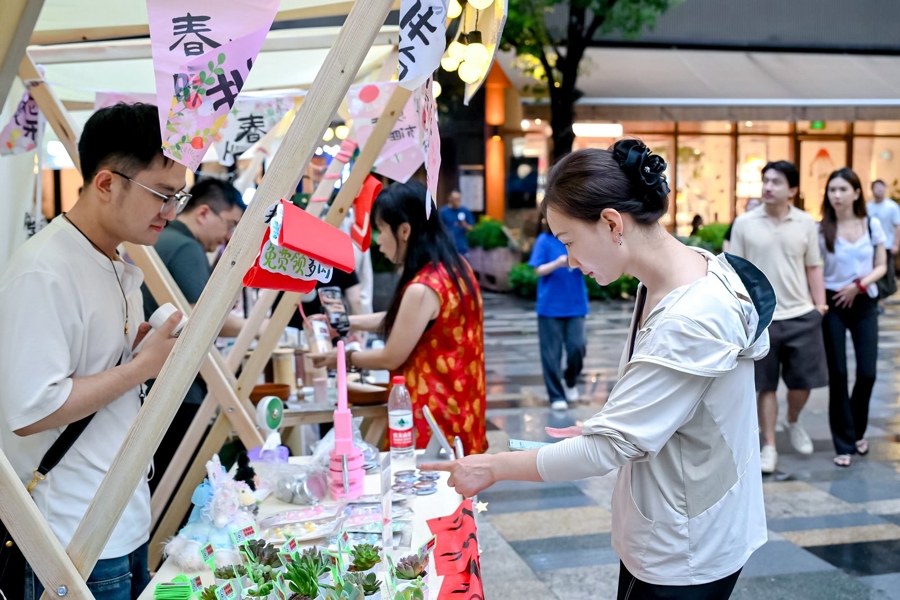 尚想绘带来在地学生的艺术作品展示;箭丽艺术在市集上提供小军鼓体验,从基础持槌姿势、到简单的节奏型演奏。中国邮政展示了一系列与国产热门动漫《哪吒之魔童降世》联名的文创产品。寻遗榭美学空间和景德镇陶瓷研究院的宋锦胸针、古法香牌吸引了不少人的目光,在沉浸式体验中让人感受到非遗的独特韵味。