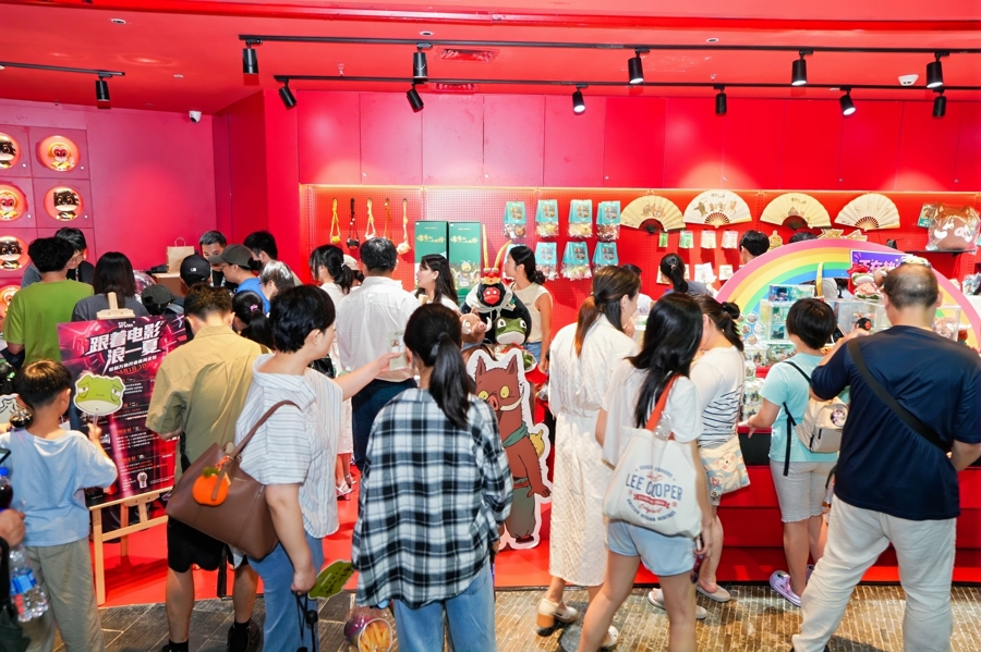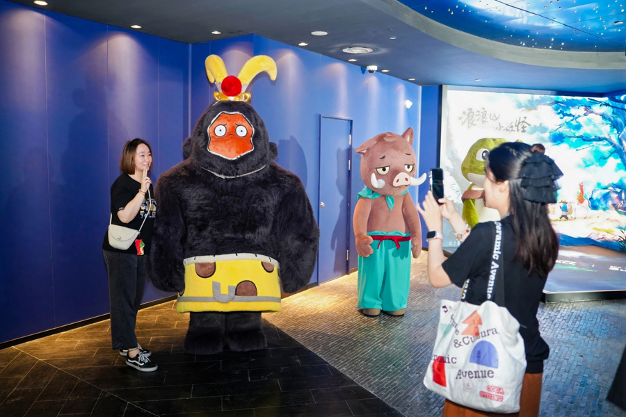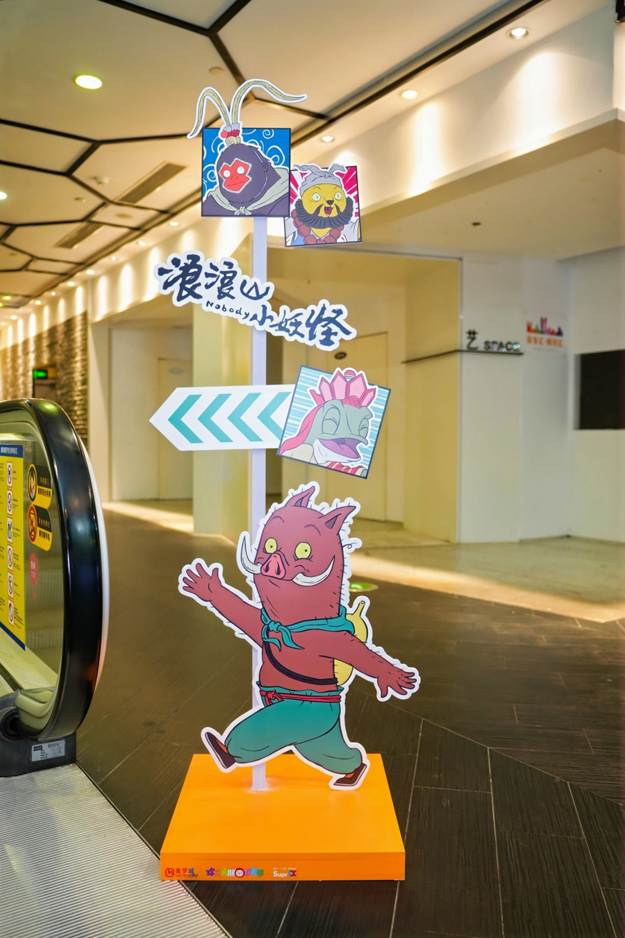 从走出“徐家汇”地铁站的那一刻起,“浪浪山”主题灯箱便接连映入眼帘,悄然揭开这个奇幻宇宙的序幕;最吸睛的当属呈现在美罗城商城球幕上的“小猪妖”头像和“这条路走对了”的标语,引人驻足眺望;走进“大王洞”观影,挑选三五周边玩偶、精美文创产品,在360°环形剧场听一场“浪浪山开放麦”,在“猪妈妈茶水站”来一杯饮料……这趟沉浸式体验丰富而圆满。