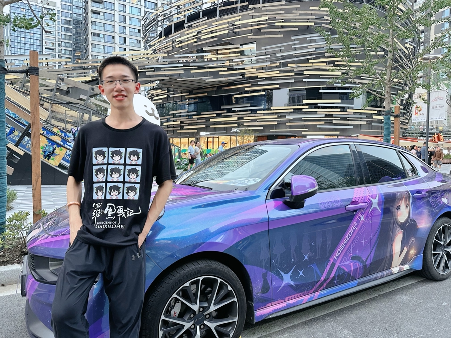 车主鲨鱼的座驾以《星空列车与白的旅行》为主题。从获得日本画师授权,到设计师将立绘与拉花巧妙结合,以及打造出炫彩细闪的星空主题车身,每一处细节都彰显着他对作品的极致热爱。车尾还印着主题曲《星空的旅途》中的歌词“闪耀的巡星之旅”。