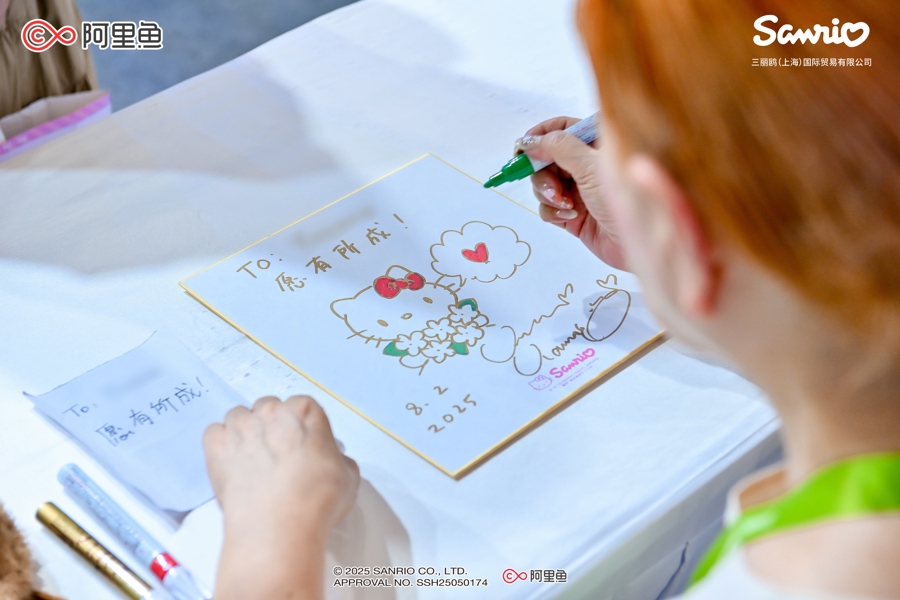 在签绘舞台区域,7位三丽鸥IP肖像设计师亲临现场,提供Hello Kitty、美乐蒂、酷洛米、必爱诺、半鱼人汉顿等10位IP角色的签绘。可爱角色跃然纸上,一位Hello Kitty粉丝激动地说:“期待了好久,终于等到这一天,山口裕子老师画的时候我眼睛都不敢眨。”