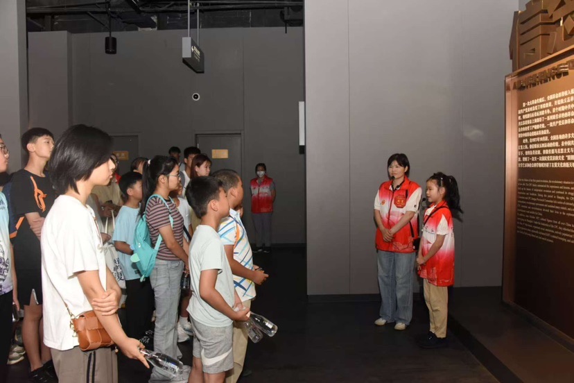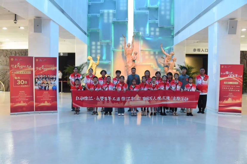 8月6日,“红动徐汇・礼赞百年工运” 百团万人观龙陵暑期专场活动在龙华烈士陵园继续开展,当天有 9 批次职工和中小学生团队 100 余名参观者走进龙陵纪念馆,包括来自徐汇环卫职工的子女们,他们当天还参加了徐汇匠心模范寻访一日营活动,而龙陵作为当天寻访的第一个打卡点,让红色基因的传承从革命先烈的精神沃土中正式启程。在市劳模余美香、尚艳华、冯知洋、符欣怡、崔丽丽,市五一奖章获得者兰凡、周翌,区劳模陈俊峭、董梁,职工志愿者王礼婧和 10 多名中小学生志愿者及工会志愿者的讲解中,参观的团队共同体验了一次包含百年工运讲解、情景演绎、红色艺术作品解析的沉浸式红色传承之旅。