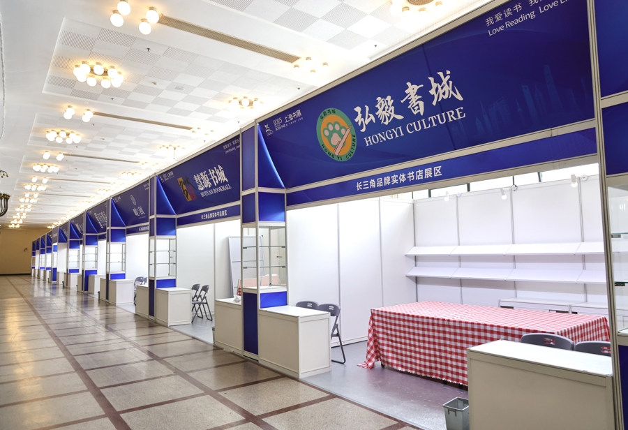 今年上海书展在东西平台上首次设立了“长三角品牌实体书店展区”,蓝底白字的标识已经竖起。这次入驻的20家书店有来自江苏的四家:大众书局、小石头书店、句容弘毅书城、慧源书城,来自浙江的晓风书屋、南宋书房、岛上书店、安定书院,来自安徽元·书局、前言后记、徽州书局、黄山孔乙己书店,来自上海的朵云书院、钟书阁、混知书店、大隐书局、悦悦书店、读者·文创空间、博林书店、香蕉鱼书店参展,充分体现“一店一主题、家家有亮点”的特色,共同营造书香氛围。