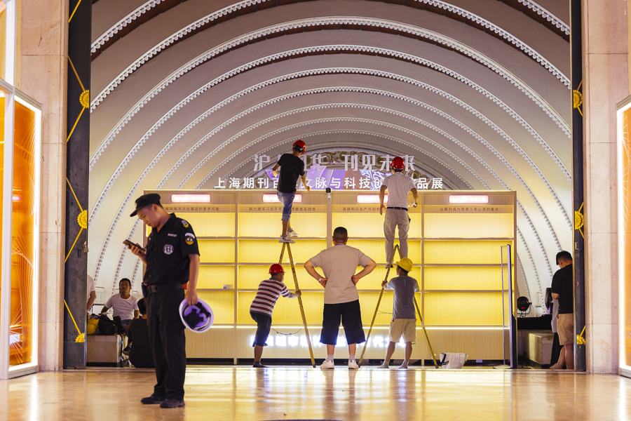 不少参展商展位已具规模,一摞摞图书整理陈列,主题展区设计逐渐清晰,静待读者探索与发现。中央大厅两侧楼梯上去的序馆,多了“沪上风华 刊见未来”上海期刊精品展专区。