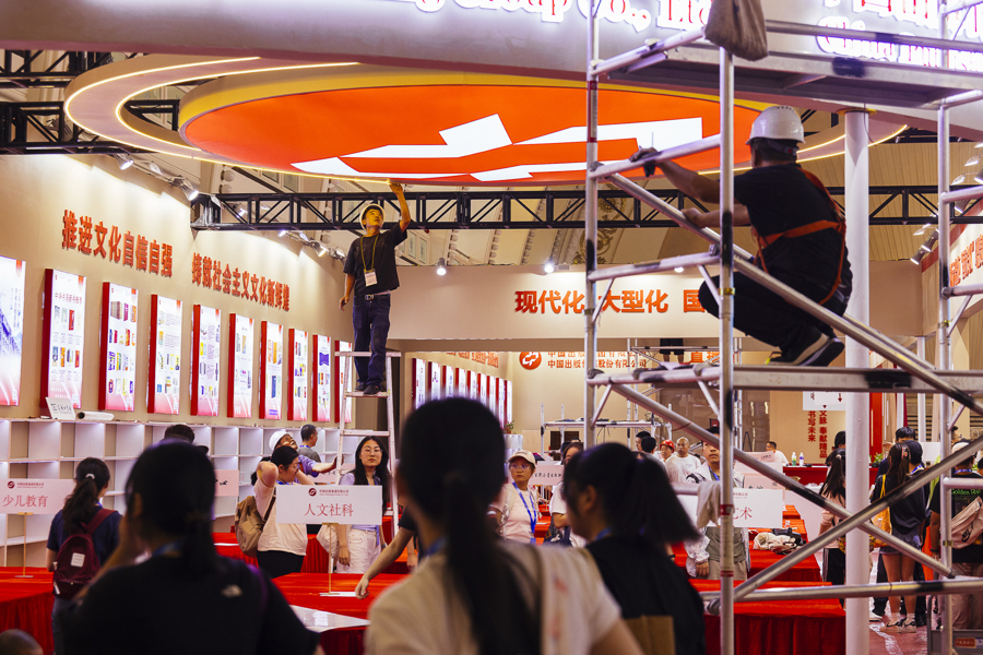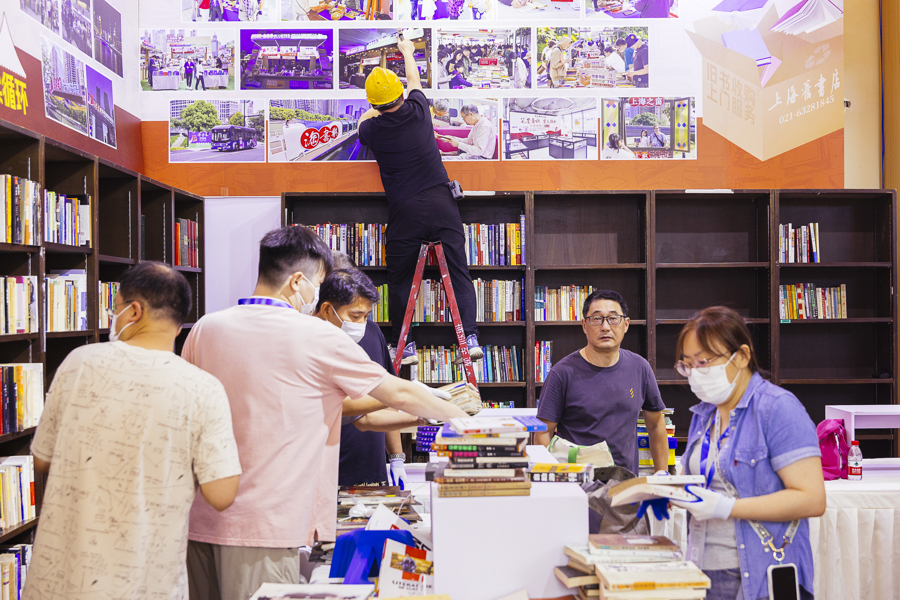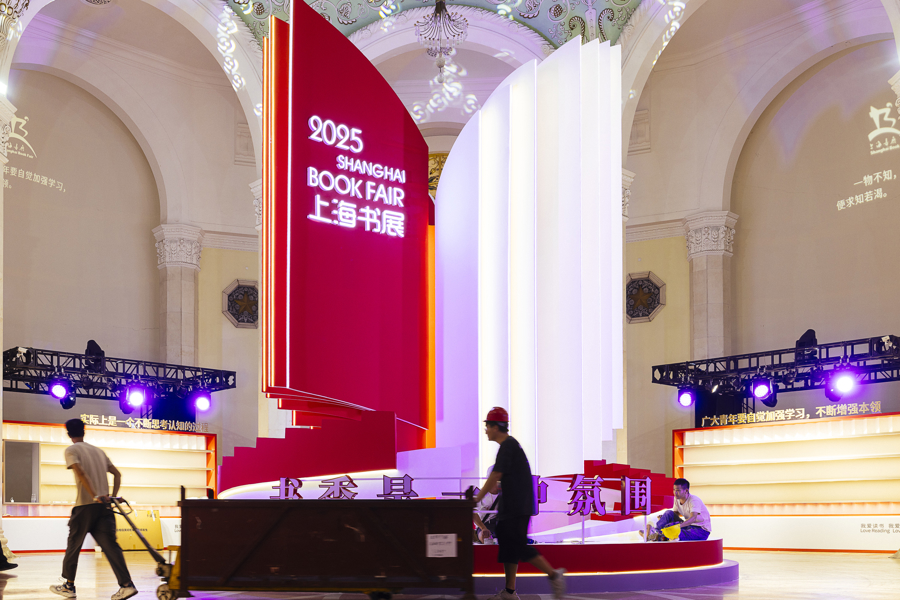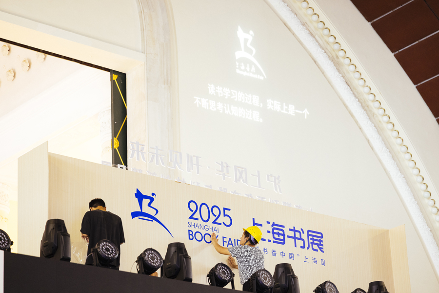2025上海书展暨“书香中国”上海周将于8月13-19日在上海展览中心、上海书城举办,打造“双主场+X+N”模式,进一步提升服务空间,主会场规模将达约4.2万平方米。文汇报记者提前探营,主会场之一上海展览中心紧锣密鼓冲刺布展,搭台、卸货、拆包、分类、上架,场内热火朝天,工作人员用汗水接力搭建知识“长廊”。友谊会堂门口新搭遮阳帐篷,为读者排队添一处凉荫。