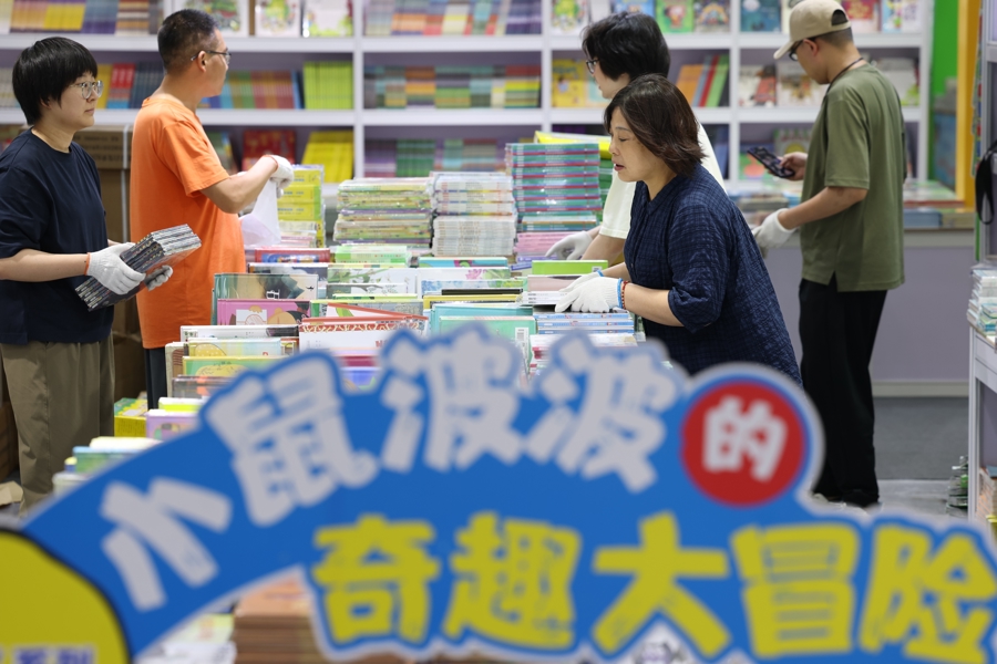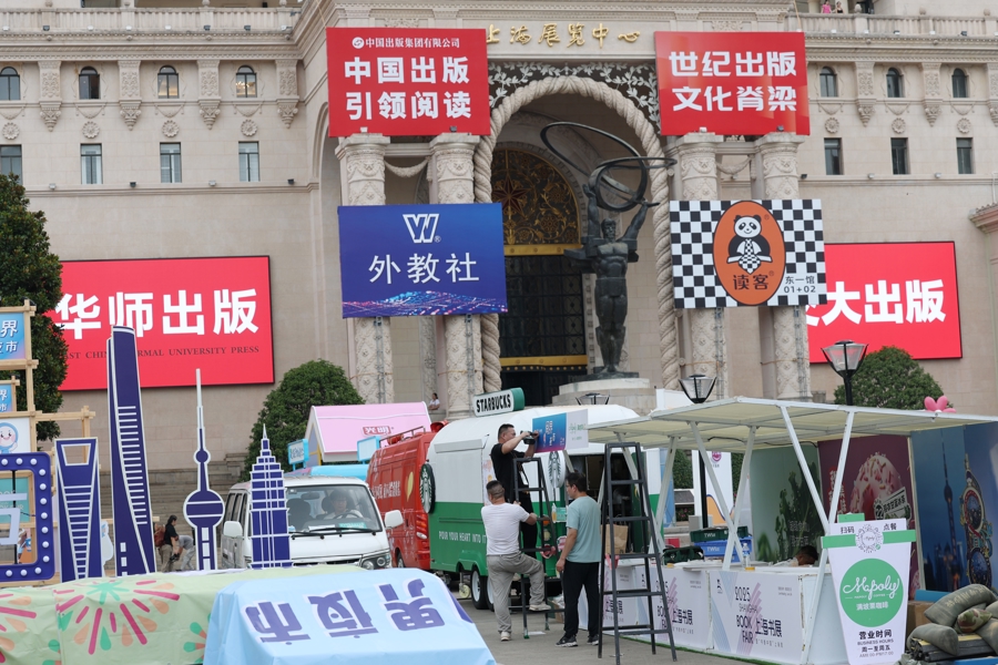 8月12日,记者探营2025上海书展,工作人员正在上海展览中心的主会场内加班加点摆放图书,布置展台。