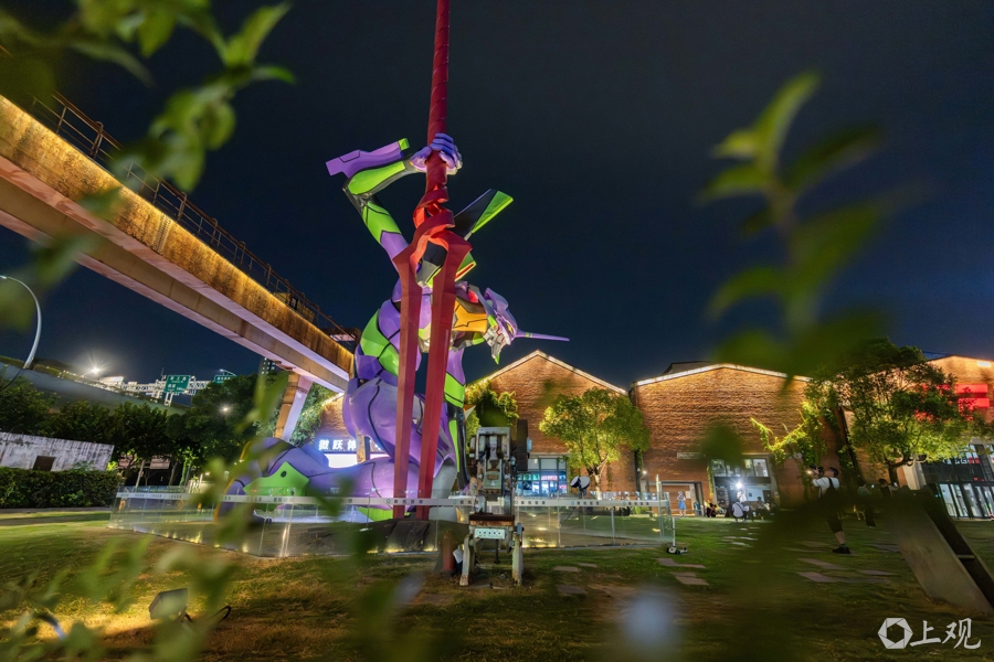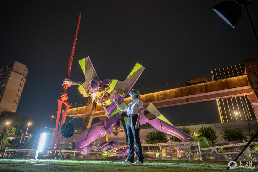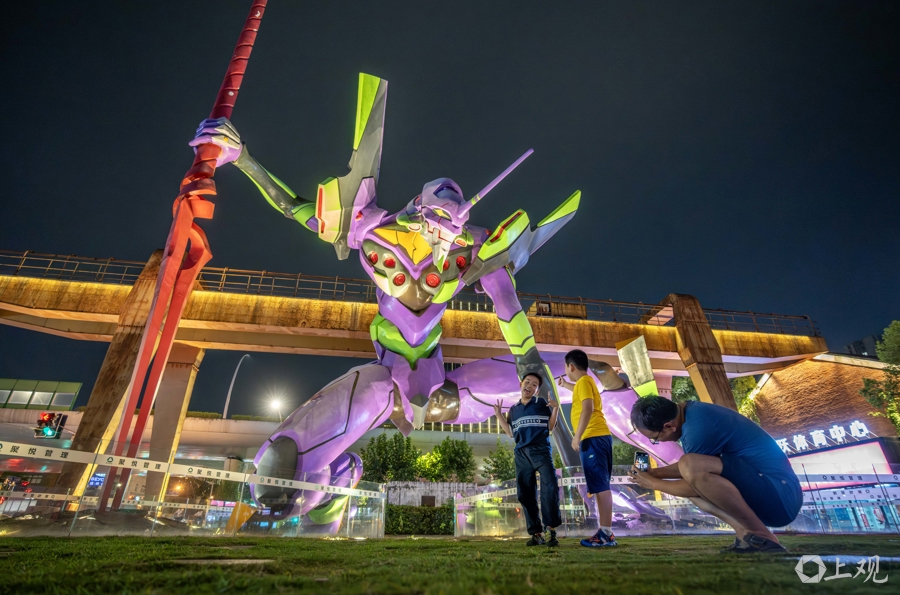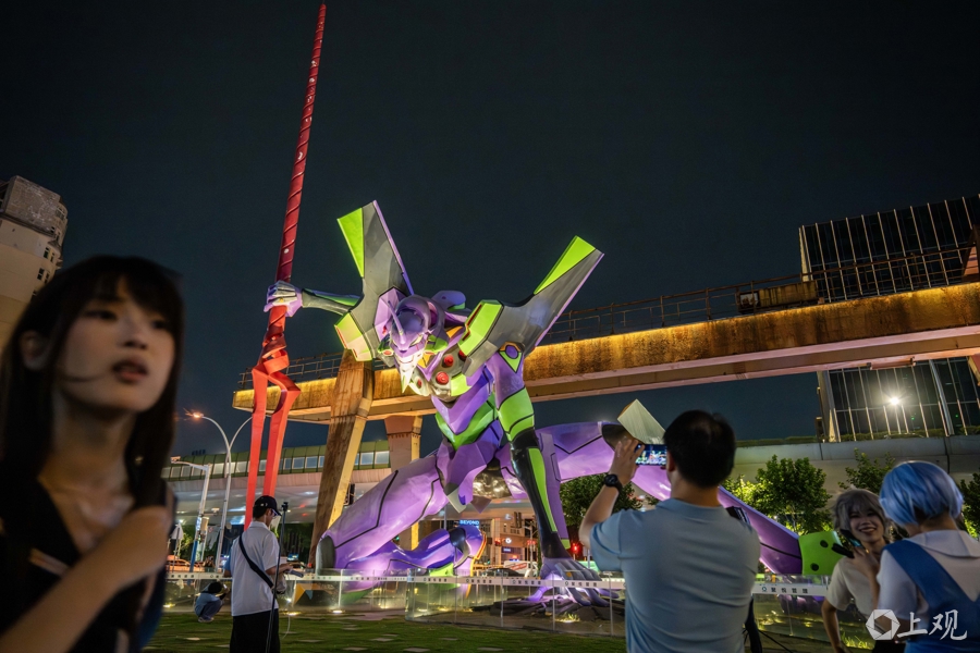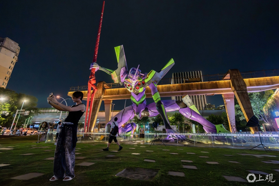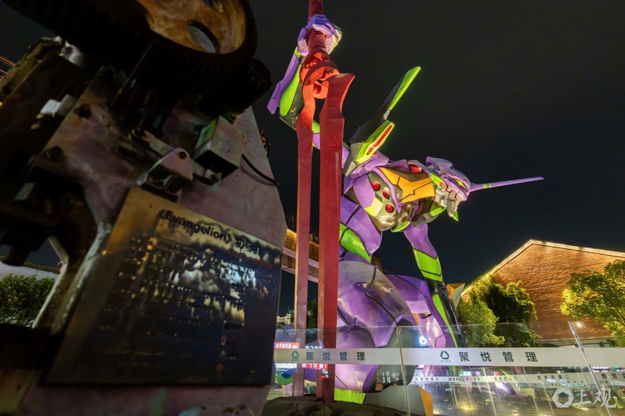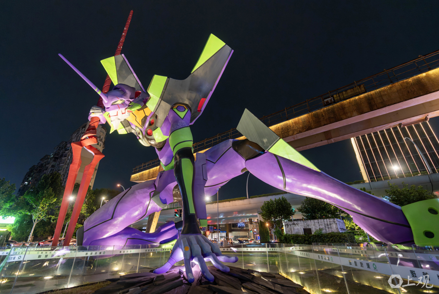 2025年8月13日夜幕降临,在汶水路中环高架旁,曾获吉尼斯世界纪录的全球最大动漫雕塑EVA初号机在灯光的映照下格外炫酷,25米高的巨型雕塑更是吸引了来自全国各地的粉迷们前来观赏留影。