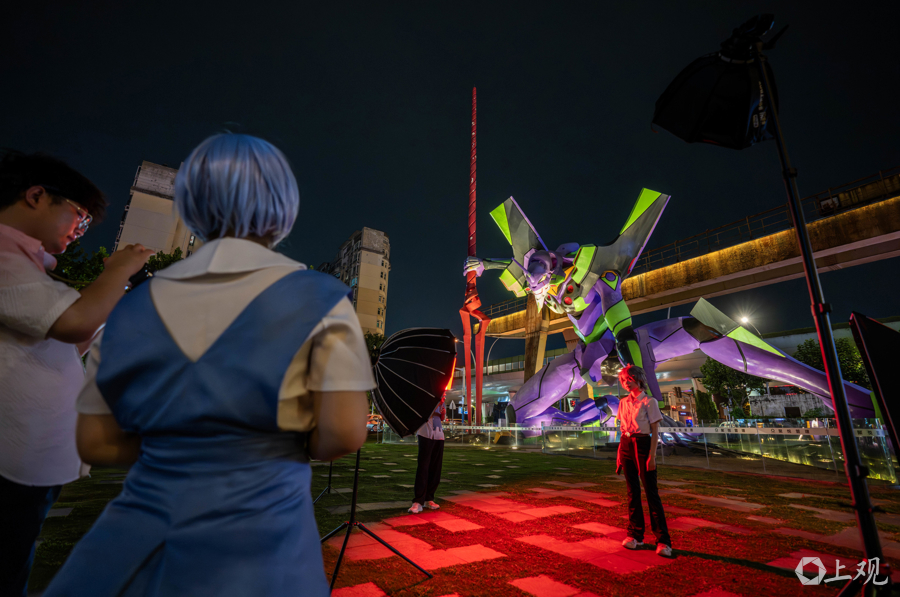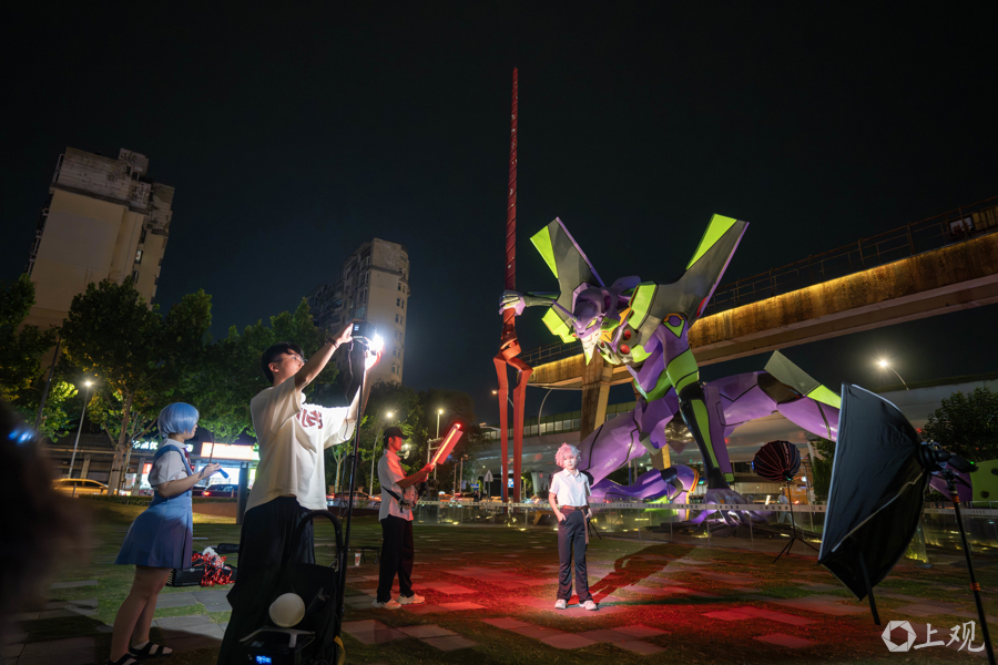 “暑假和朋友们来上海看CJ展和复兴岛Redland活动的,可惜复兴岛的票没抢到,心有不甘,就来这里‘朝圣’。”当晚,来自安徽的00后漫粉小贾和朋友们专门装扮成了EVA动漫里的角色模样,与EVA初号机合影。“其实到上海,我们漫迷就觉得到家了,不一定是要看那些大型的展会,在上海的街头巷尾哪怕奶茶店都能找到同好,二次元元素也多,去金桥看高达,来静安拍EVA也是资深漫粉的‘必修课’。”