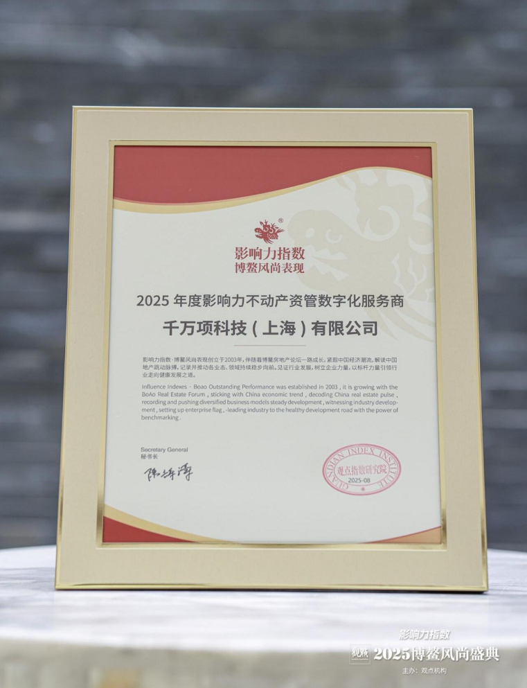 (2025年8月13日,海南博鳌) 盛大举行的2025博鳌房地产论坛上,千万项科技(上海)有限公司(以下简称“千万项”)凭借其领先的技术实力与深远的行业影响力,荣膺“2025年度影响力不动产资管数字化服务商”奖项,并成为全国唯一获此殊荣的企业!这不仅是对千万项创新能力的权威认可,更是对商业不动产资产数字化管理未来趋势的前瞻性印证。