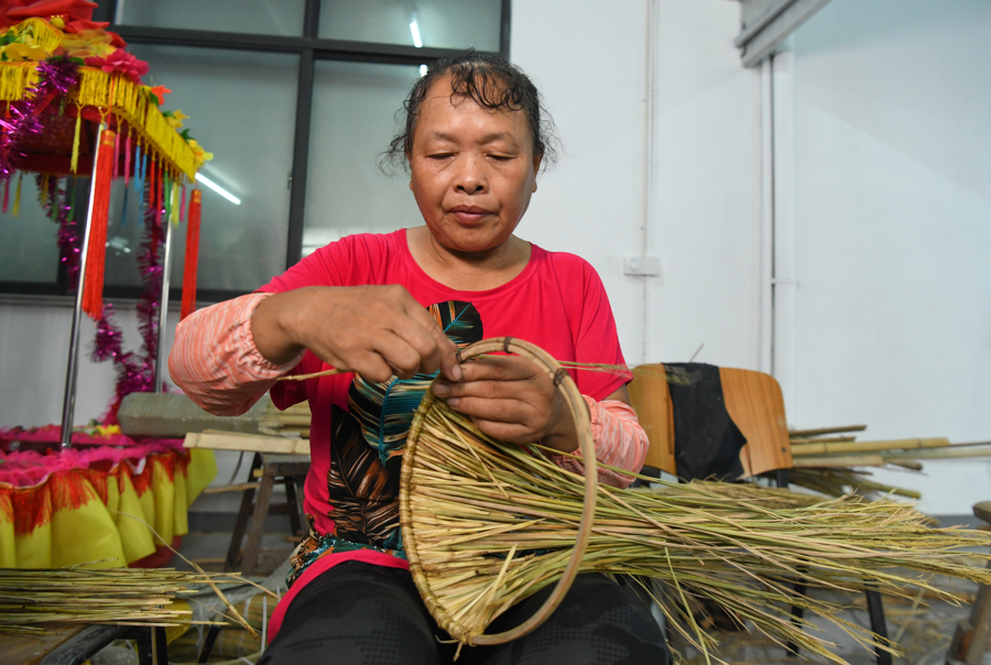 图说:叶榭镇非遗竹编传承工作室成员正在制作草龙。