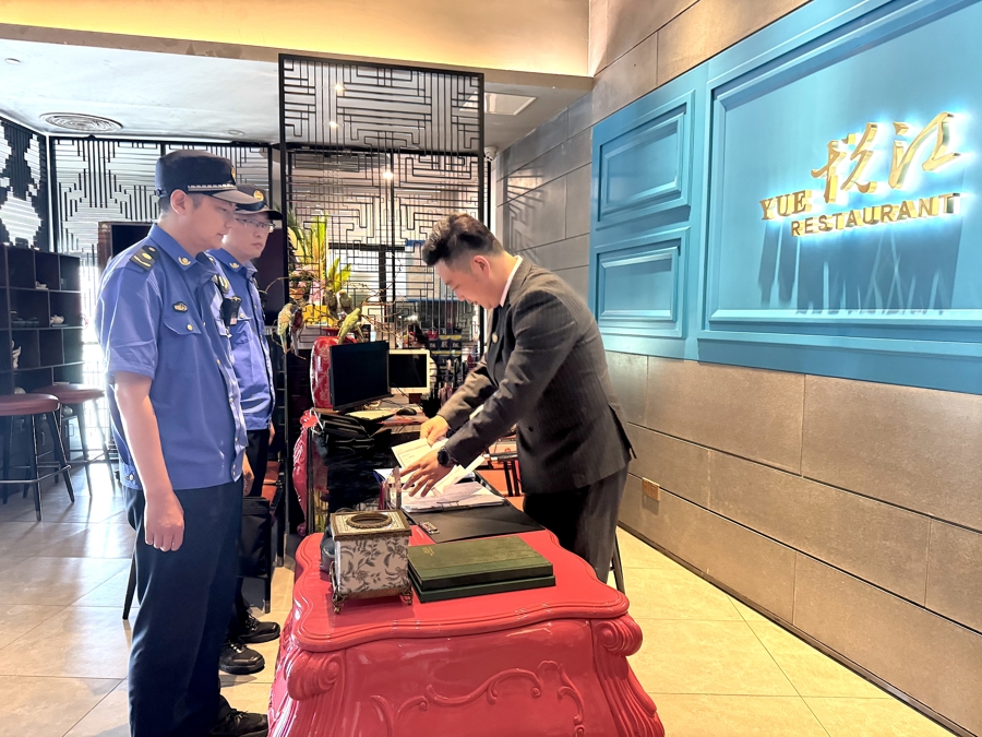 8月14日下午,周家渡街道综合行政执法队队员到位于梅赛德斯奔驰文化中心的悦江餐厅开展涉企分类分级监管与“综合查一次”规范执法。舒抒 摄