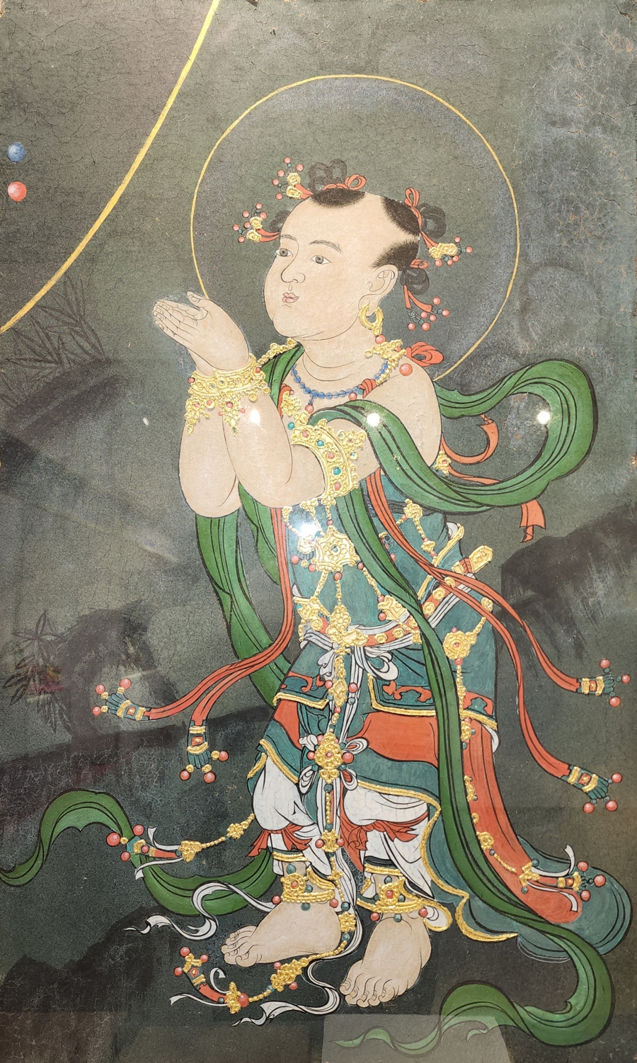 与书展相呼应,崔煜堃特地将《善财童子》展陈在显眼位置,他作画时添入了当代阐释。“相传,善财童子曾受文殊菩萨教诲,他在画中面庞和姿态皆有纯粹、虔诚之意,可视作虚心求学的典范,这也融入到书展和书城的氛围中。”用非遗技法结合当代审美,这样一幅非遗壁画作品,做泥底、勾线、填色,往往要花两三个月的时间完成。