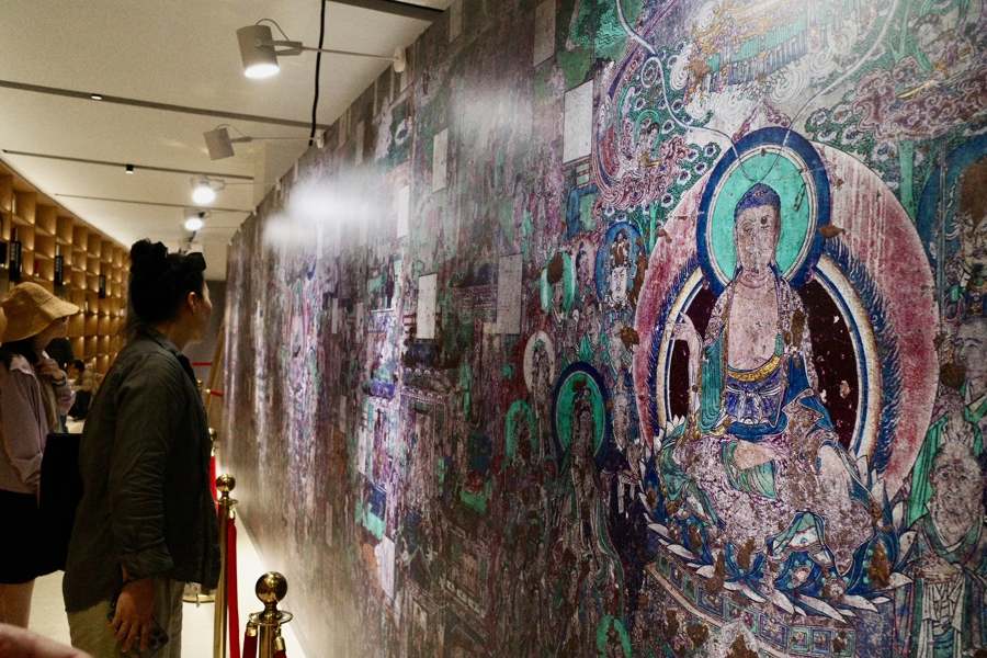 上海书城六楼,人们正在观赏山西开化寺国宝级壁画《清凉兰若图》(复制图)。(受访者供图)