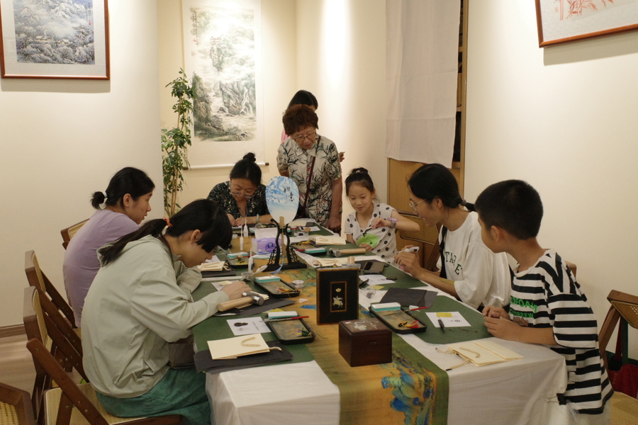 陈艺和妈妈谢晨正在体验螺钿技艺。(孙彦扬摄)