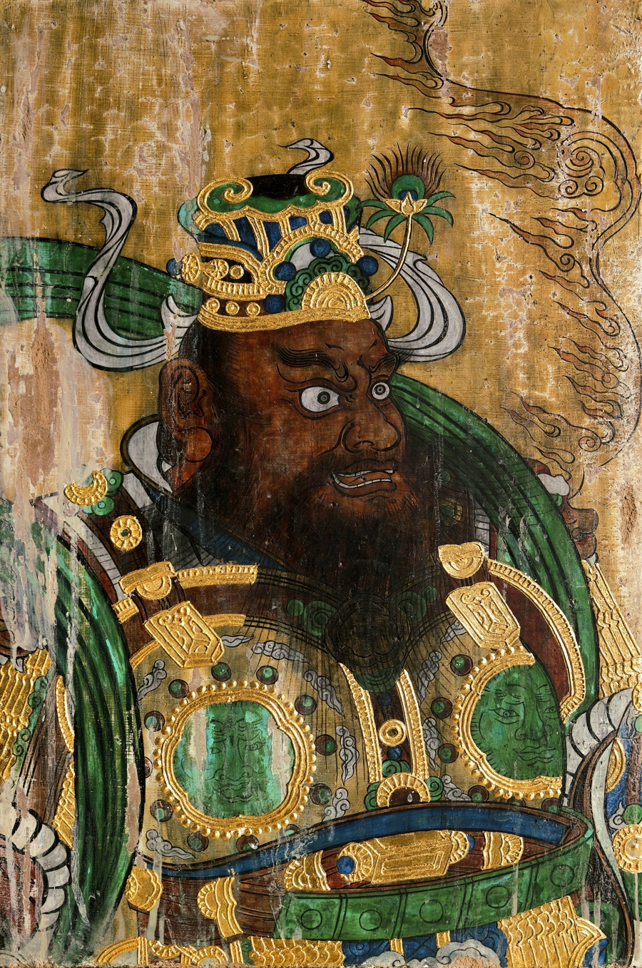 尽管已近八十岁,丁照宏仍然喜欢新鲜事物,他在一幅《白虎星君》止步不前。山西古建壁画第五代非遗传承人崔煜堃主动上前介绍,“白虎有‘战无不胜’的寓意,古代打仗前通常会祭祀白虎星君像。这幅画首先是线条的粗细变化造成视觉张力,其上有24k纯金,浓郁色彩则是采用的天然矿石颜料。”山西古建壁画仿佛“金墙玉璧”,其上常贴金、贴宝石,就连多彩的矿石颜料也价值不菲,因此山西开化寺国宝级壁画《清凉兰若图》的存世版本中,多是流传时被扣下真金的累累斑痕,这也造就了文物的独特记忆。