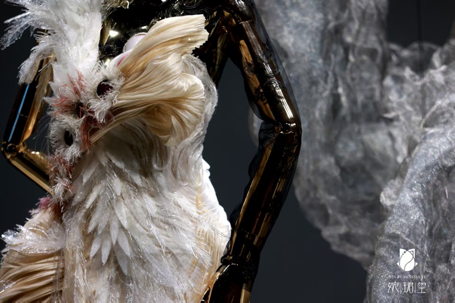 “灵感来源于东滩湿地以及一度濒临灭绝的东方白鹳。”叶青介绍,在非遗环保装置艺术作品《鹳鸣东方·经纬共生》中,她以白鹳为主题进行创作,“我们用3D打印的羽翼结构模拟鸟羽的轻盈与脆弱,用海派钩针和海派编结技艺将破碎的瓷片编织成‘修复生态’的脉络。人工智能机器人的出现,象征科技助力下的生态桥梁。”她介绍,作品所用的瓷片是专程从景德镇收集来的一些烧窑时产生的破碎、烧坏的碎瓷,并通过钩针,让碎瓷片变成服装上花朵样的装饰。“科技在某种程度上不仅为我们带来了灵感,还让时尚变得更环保;衣服上的羽毛,全部使用可回收可循环的绿色材料。”