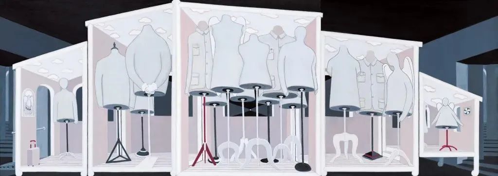比如,起初我看小尺寸版本时,怎么也想不明白,为什么在一个灰色空间里,排列五个梦幻粉色的房间,每个房间里都摆放着数量、样式各异的假人,这样的作品却被命名为《隧道》?读了作者的自注,才知道画面中心有一颗表示隧道出口的光斑。正是这颗光斑的存在,使这幅画的命名得以成立。为了这颗在小尺寸版本上几乎看不见的白点,作者甚至多次细致调整画面中的地平线位置。只有在放大了的图幅中,这颗光斑才能轻易找出。在这种情况下,简洁的内折拉页的设计尤为重要。不仅允许放大展现画作细节,同时不给翻页增添负担,恰到好处地服务于阅读体验。