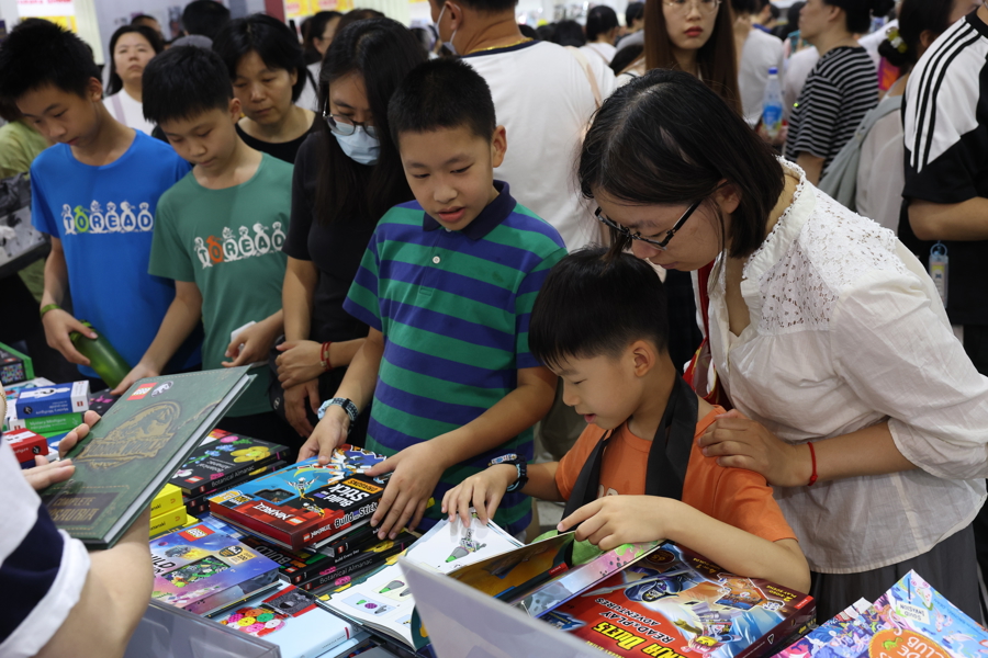 家长陪伴孩子在书展现场挑选图书。